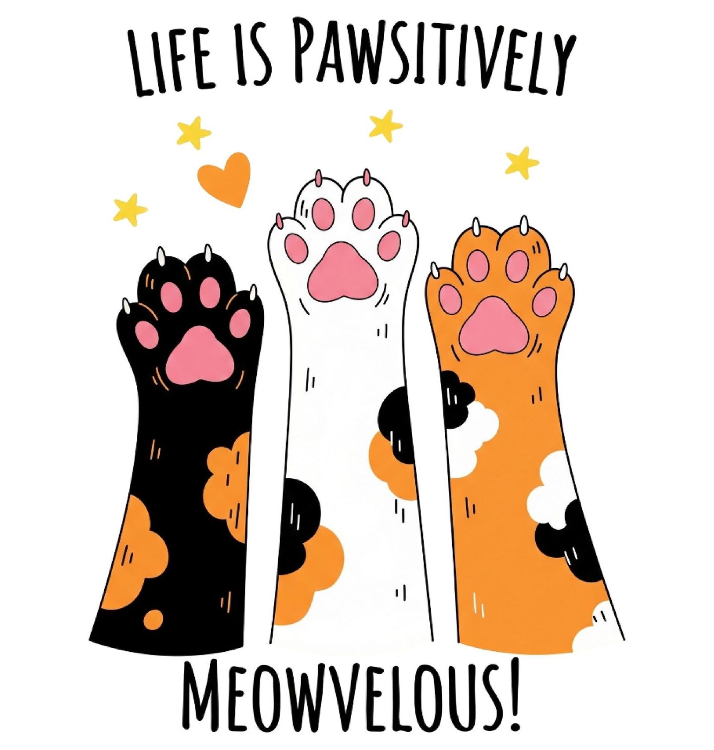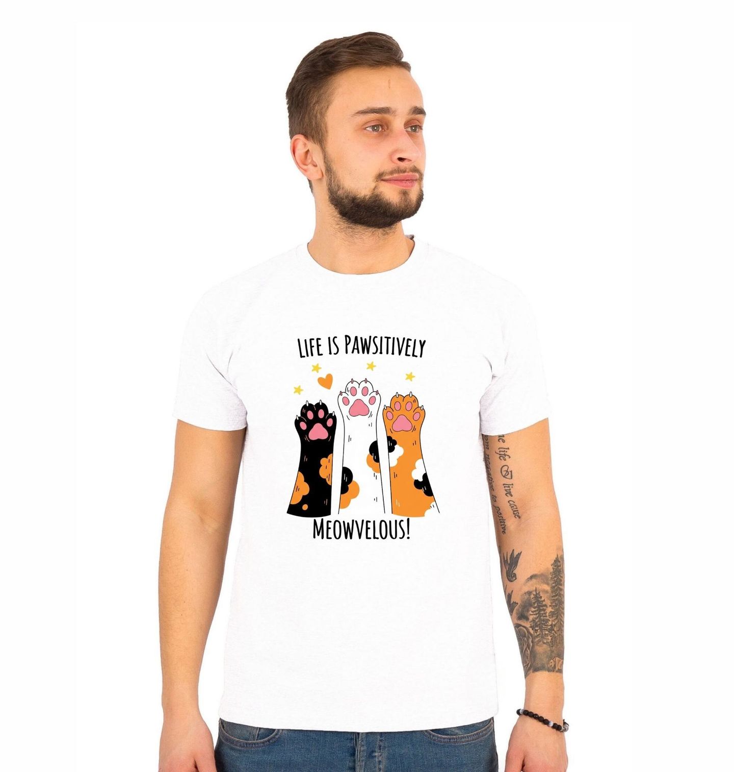 Pánské tričko Life is pawsitively meowvelous! Pozitivní energie, hebké tlapky a radost ze života – přesně tohle vyzařuje tričko s motivem tří barevných kočičích packek a nápisem „Life is pawsitively meowvelous!“ (Život je naprosto tlapičkově úžasný!). Kočka ti vždy připomene, že život je krásný… když ho žiješ s chlupy a humorem.