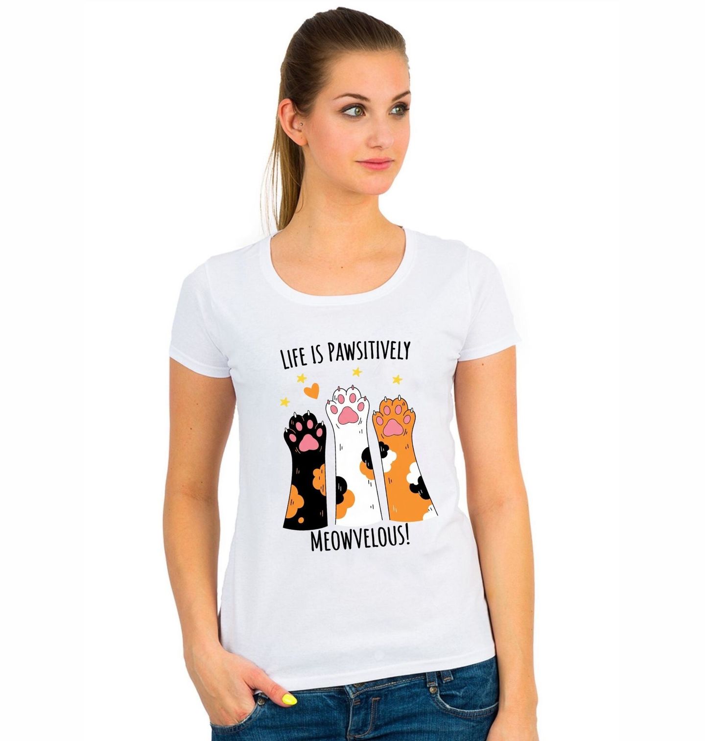 Dámské tričko Life is pawsitively meowvelous! Pozitivní energie, hebké tlapky a radost ze života – přesně tohle vyzařuje tričko s motivem tří barevných kočičích packek a nápisem „Life is pawsitively meowvelous!“ (Život je naprosto tlapičkově úžasný!). Kočka ti vždy připomene, že život je krásný… když ho žiješ s chlupy a humorem.