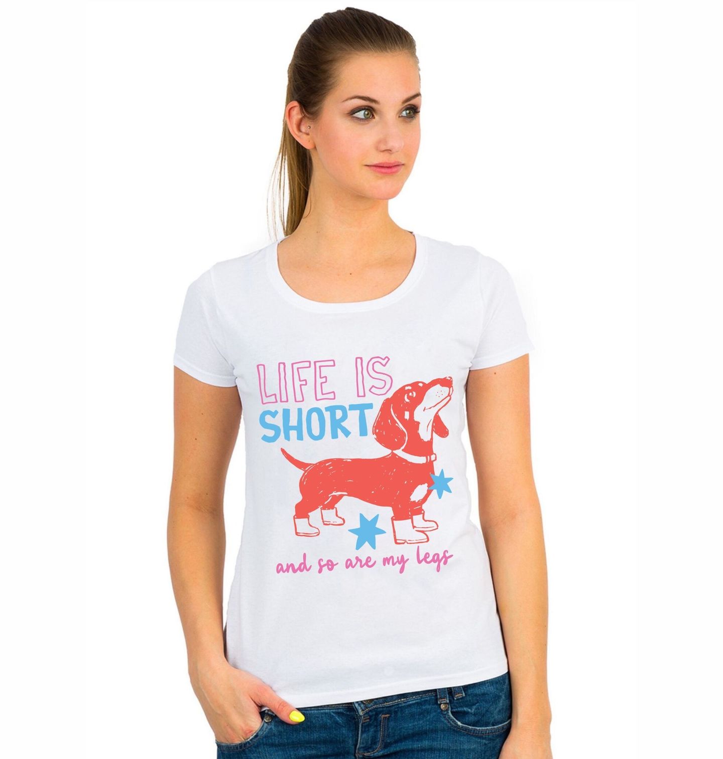 Dámské tričko Life is Short Jezevčík. Vtipný design oranžového jezevčíka s krátkýma nohama, doplněný hravým barevným textem a hvězdičkami. Motiv zdůrazňuje humor a roztomilost tohoto plemene. Text na obrázku: „LIFE IS SHORT AND SO ARE MY LEGS“ (Život je krátký a stejně tak i moje nohy). Tento motiv je vhodný pro milovníky jezevčíků a všechny, kdo mají smysl pro humor.