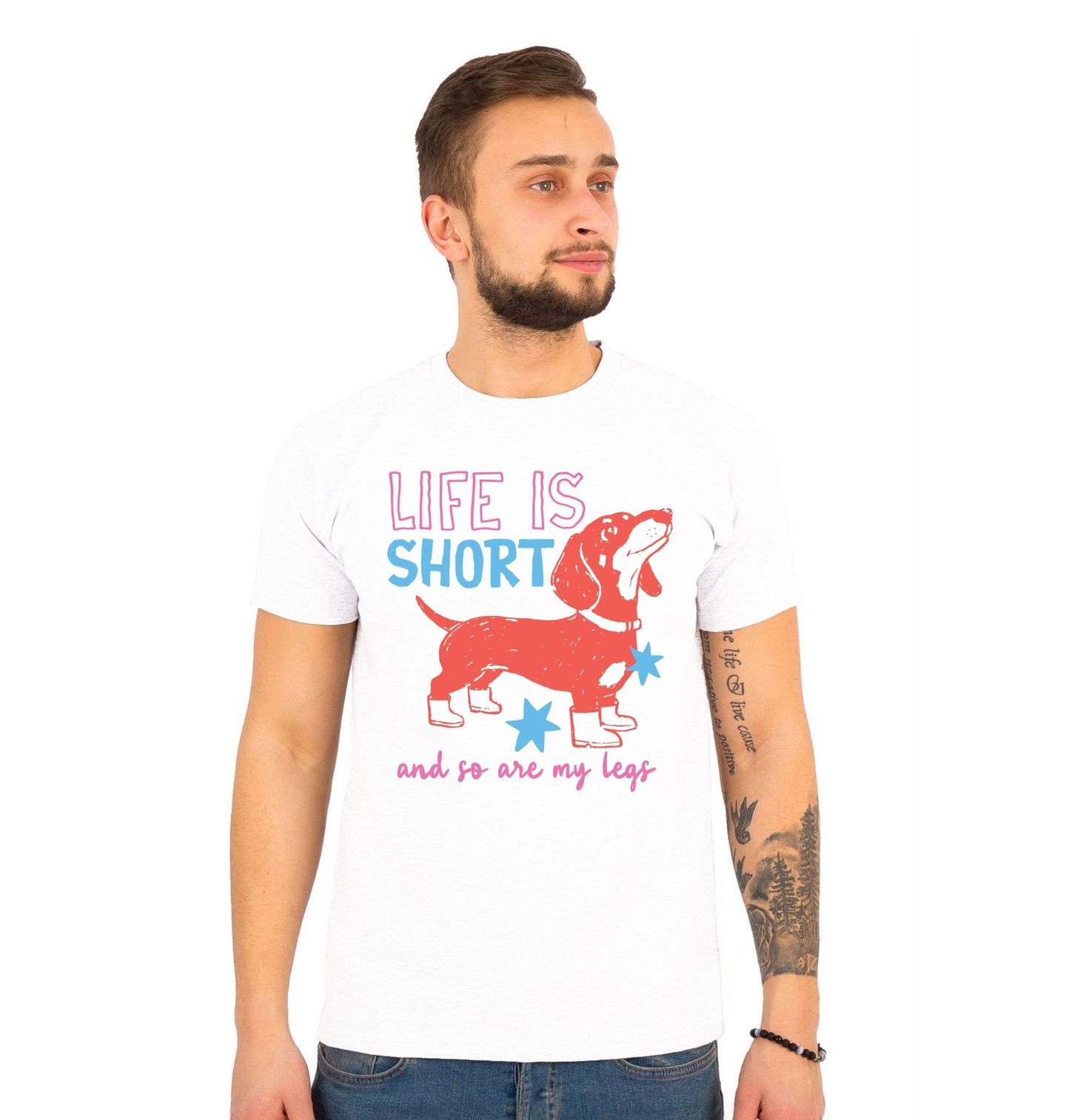 Pánské tričko Life is Short Jezevčík. Vtipný design oranžového jezevčíka s krátkýma nohama, doplněný hravým barevným textem a hvězdičkami. Motiv zdůrazňuje humor a roztomilost tohoto plemene. Text na obrázku: „LIFE IS SHORT AND SO ARE MY LEGS“ (Život je krátký a stejně tak i moje nohy). Tento motiv je vhodný pro milovníky jezevčíků a všechny, kdo mají smysl pro humor.