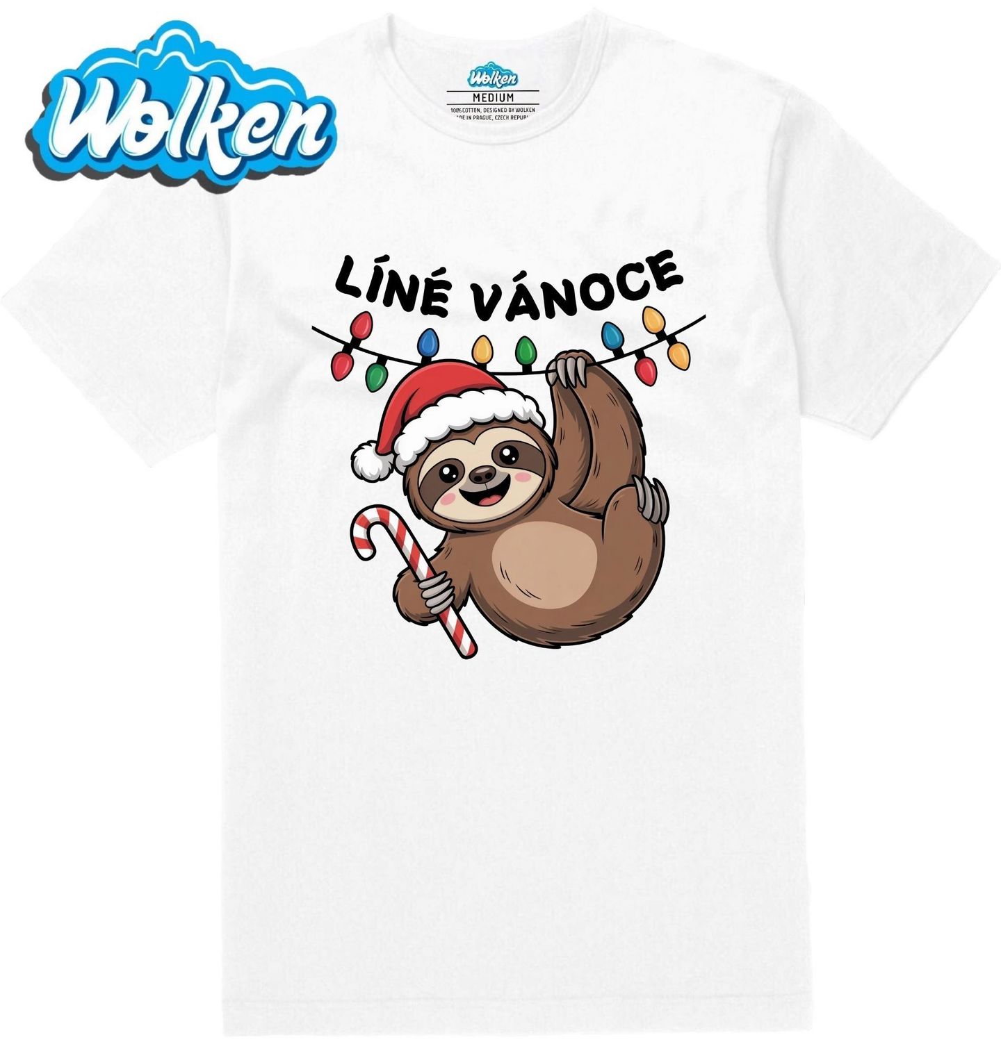 Pánské tričko Líné Vánoce Mládě Lenochoda. Tento veselý motiv s nápisem „Líné Vánoce“ je jako stvořený pro všechny, kteří chtějí prožít Vánoce v klidu, pohodě a s úsměvem. Roztomilý lenochod se Santovskou čepicí a lízátkem perfektně vystihuje sváteční náladu bez stresu a shonu.