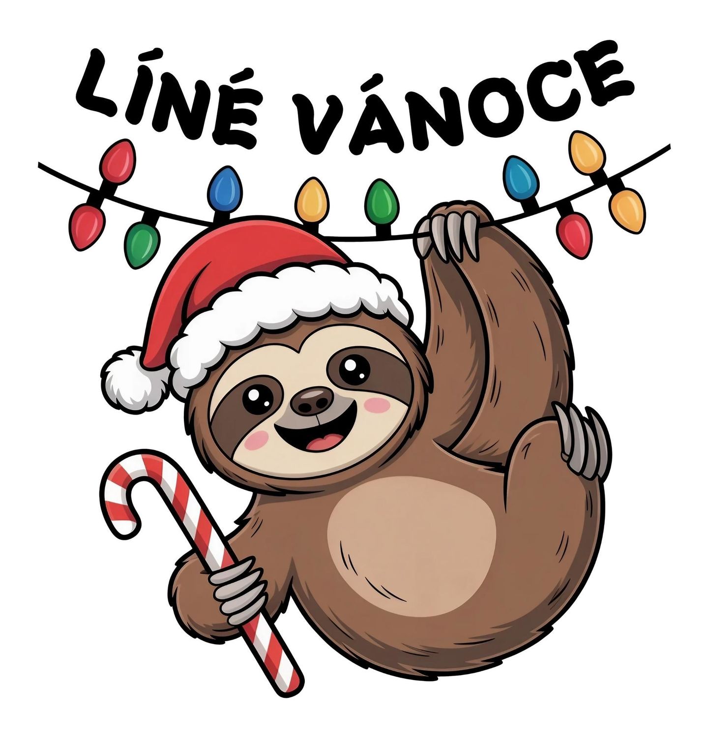 Dámské tričko Líné Vánoce Mládě Lenochoda. Tento veselý motiv s nápisem „Líné Vánoce“ je jako stvořený pro všechny, kteří chtějí prožít Vánoce v klidu, pohodě a s úsměvem. Roztomilý lenochod se Santovskou čepicí a lízátkem perfektně vystihuje sváteční náladu bez stresu a shonu.