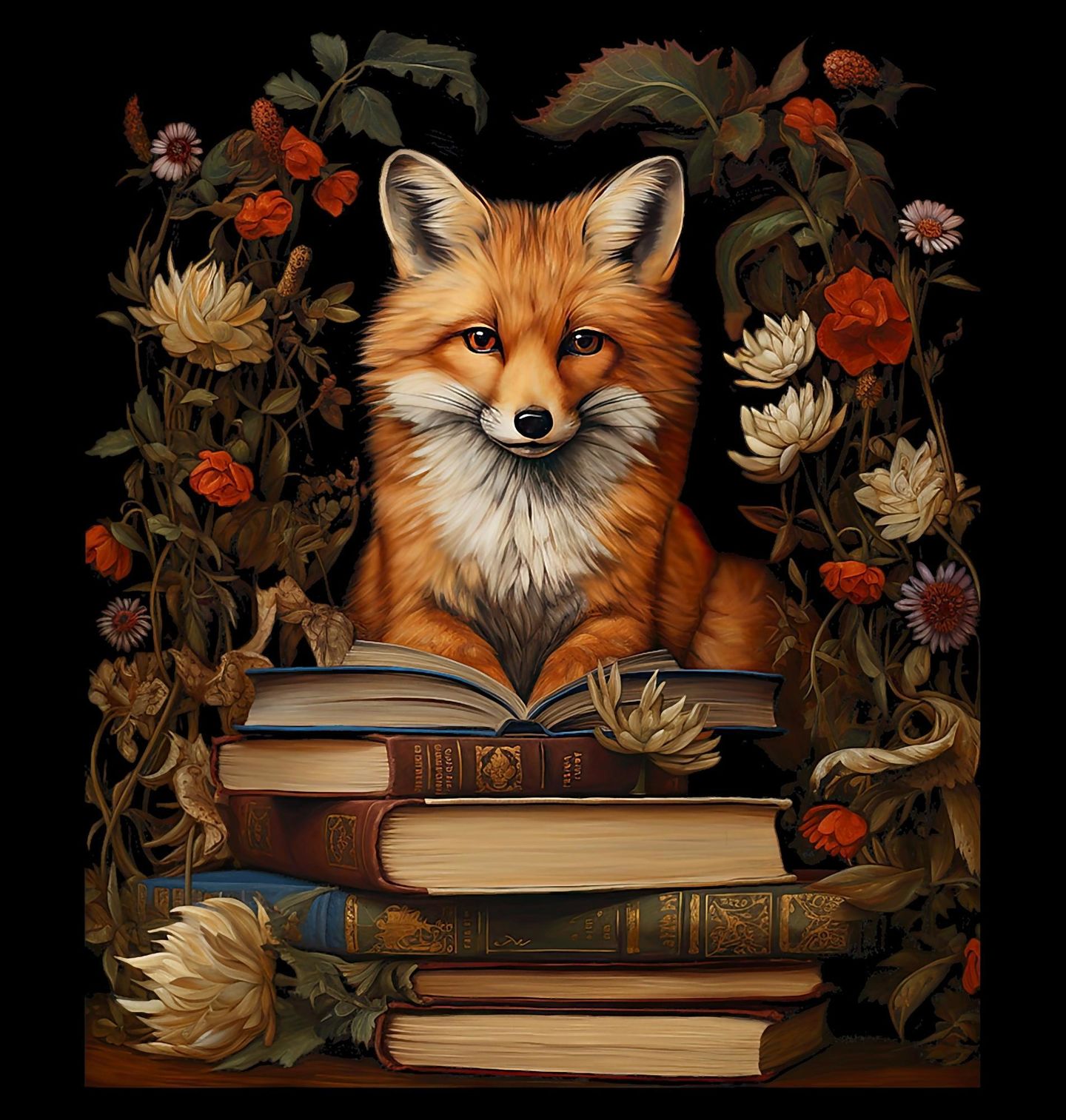 Dámské tričko Liška mezi Knihami. Kouzelná liška obklopená starými knihami, květinami a tajemnou atmosférou staré knihovny – ideální motiv pro milovníky přírody, pohádek a čtení. Detailní ilustrace v sobě spojuje moudrost zvířecí říše a krásu klasické literatury.