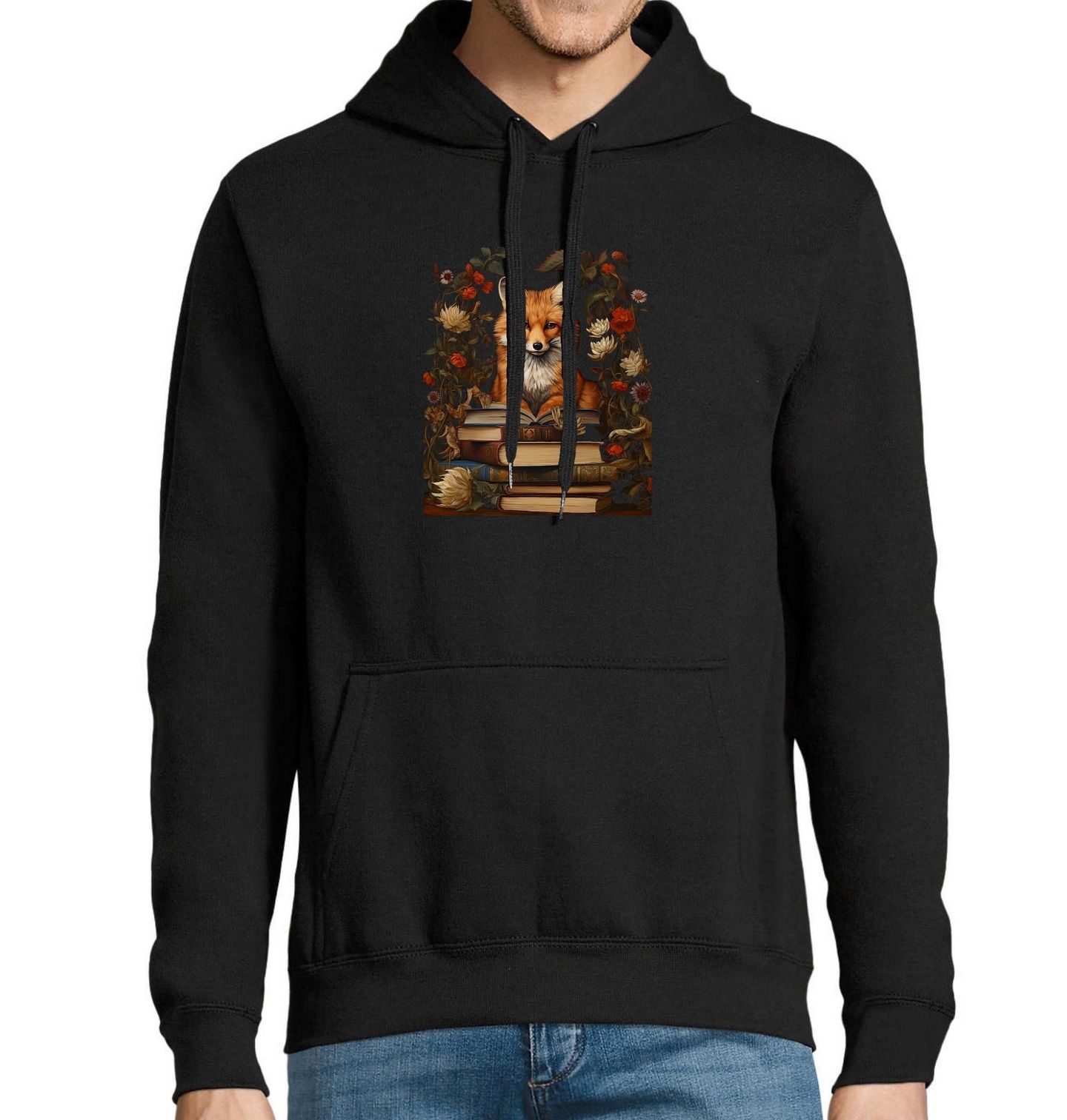 Pánská mikina Liška mezi Knihami. Kouzelná liška obklopená starými knihami, květinami a tajemnou atmosférou staré knihovny – ideální motiv pro milovníky přírody, pohádek a čtení. Detailní ilustrace v sobě spojuje moudrost zvířecí říše a krásu klasické literatury.