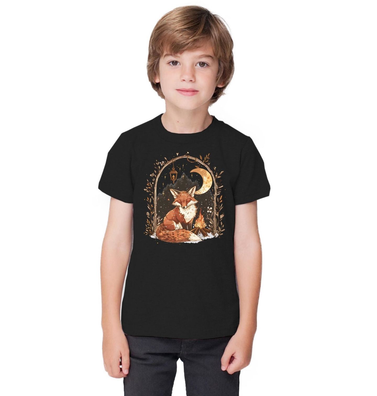 Dětské tričko Liška u Nočního Táboráku. Kouzelný motiv, kde liška klidně odpočívá u jemně plápolajícího ohně pod zářícím měsícem. Celá scéna působí snově a harmonicky, doplněná o přírodní detaily a teplé světlo, které vytváří útulnou atmosféru nočního lesa. Liška a táborák zde symbolizují klid, pohodu i spojení s přírodou.