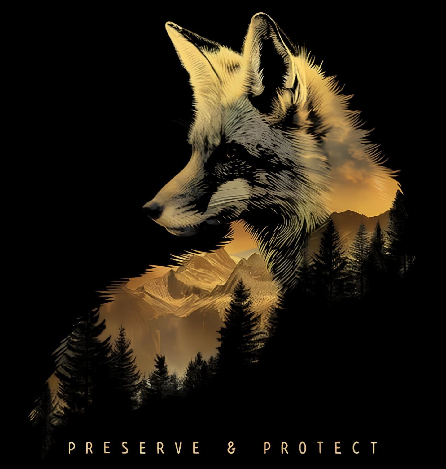 Pánské tričko Liška v Horách. Elegantní motiv lišky v kombinaci s horskou krajinou ve stylu double exposure vytváří jedinečný vizuální efekt. Text „Preserve & Protect“ znamená „Chraň a zachovej“, což odkazuje na ochranu přírody. Ideální pro milovníky divoké přírody, hor a ekologie.