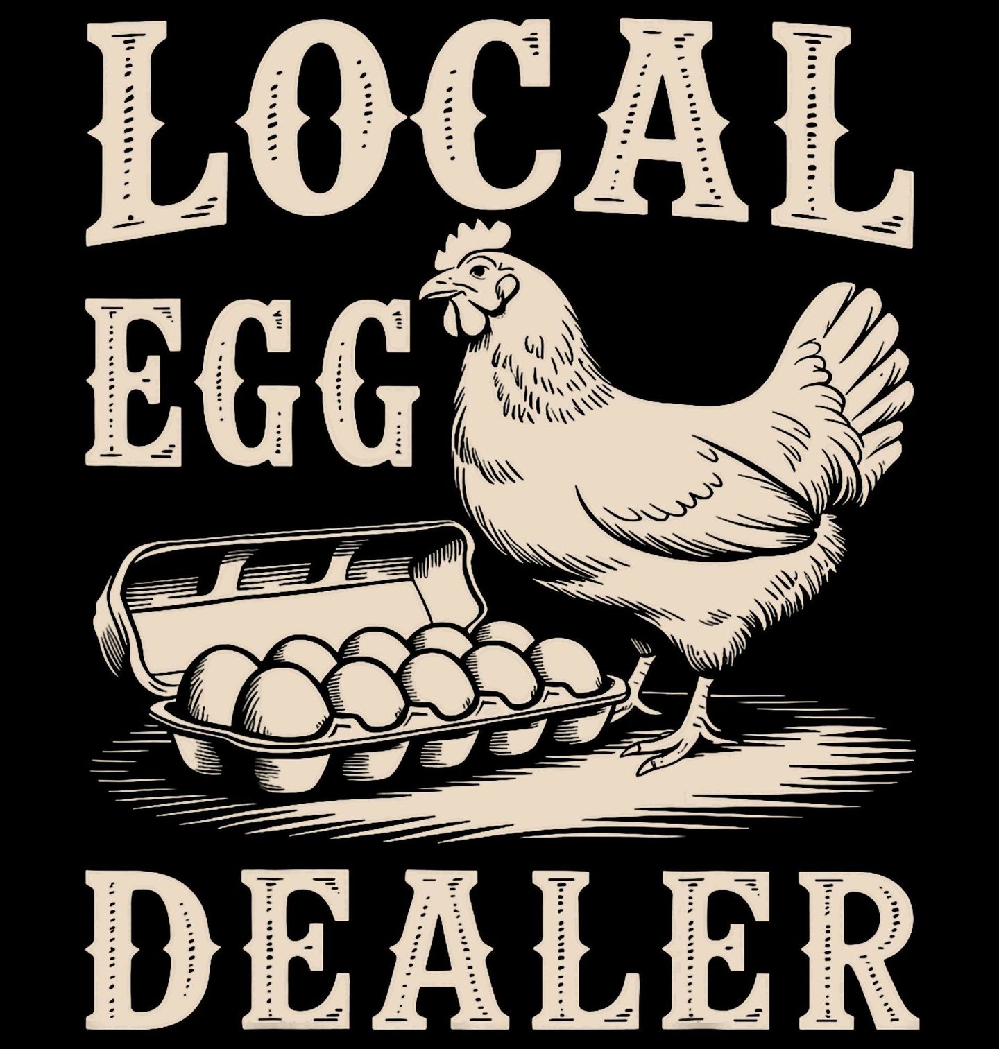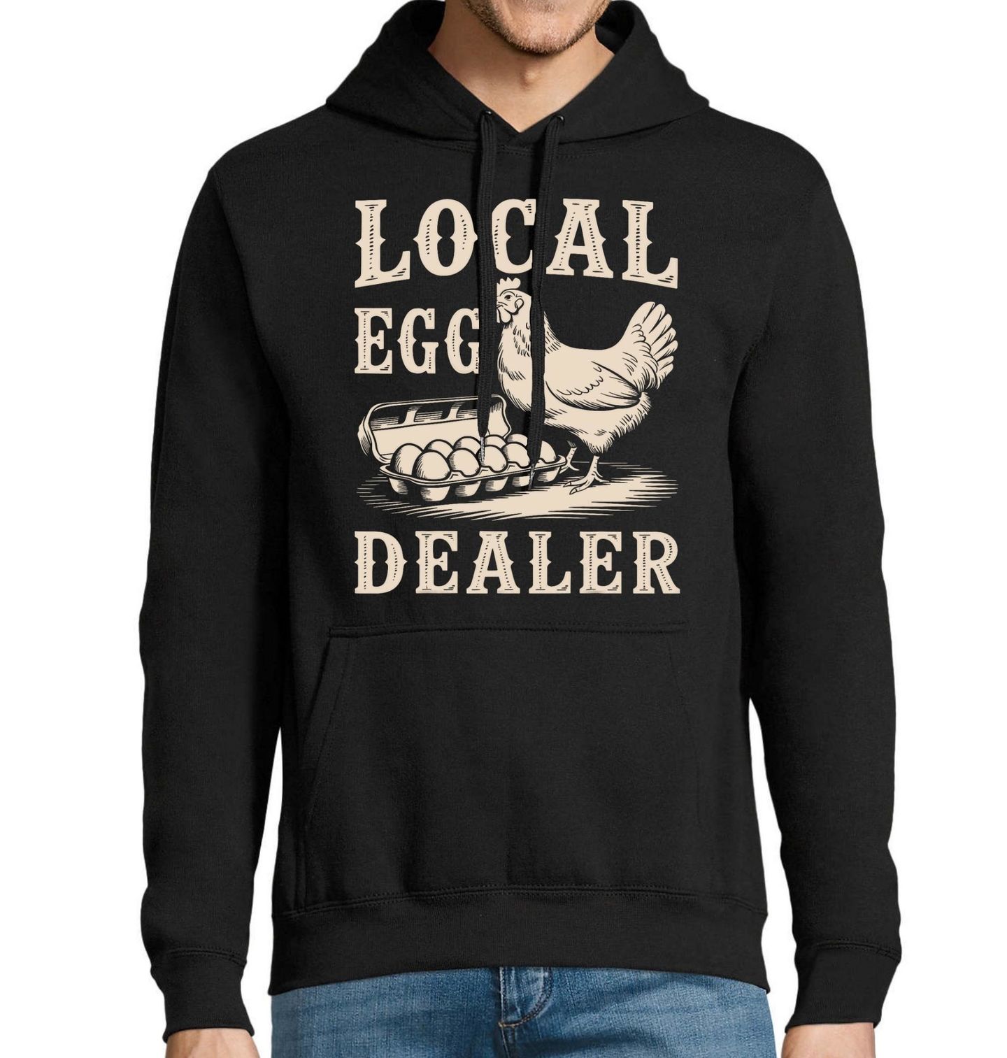 Pánská mikina Lokální Dealer Vajec. Originální motiv se slepicí a platem vajec s textem „LOCAL EGG DEALER“, což znamená „místní prodejce vajec“. Vtipné zpracování potěší farmáře, milovníky venkova i fanoušky nadsázky. Slepice zde vystupuje jako hlavní postava s humorným podtextem.