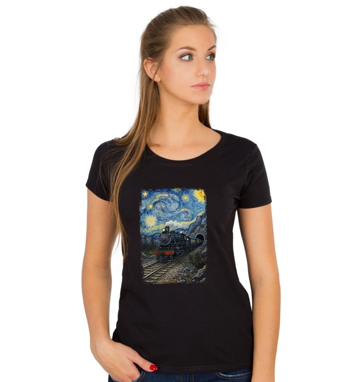Dámské tričko Lokomotiva ve Hvězdné noci. Jedinečný motiv spojuje legendární obraz Hvězdná noc a kouzelný svět železnice. Na ilustraci vidíme majestátní parní vlak, jehož černá parní lokomotiva projíždí horskou krajinou a vyjíždí z tunelu pod vířící noční oblohou, jakou proslavil malíř Vincent van Gogh.