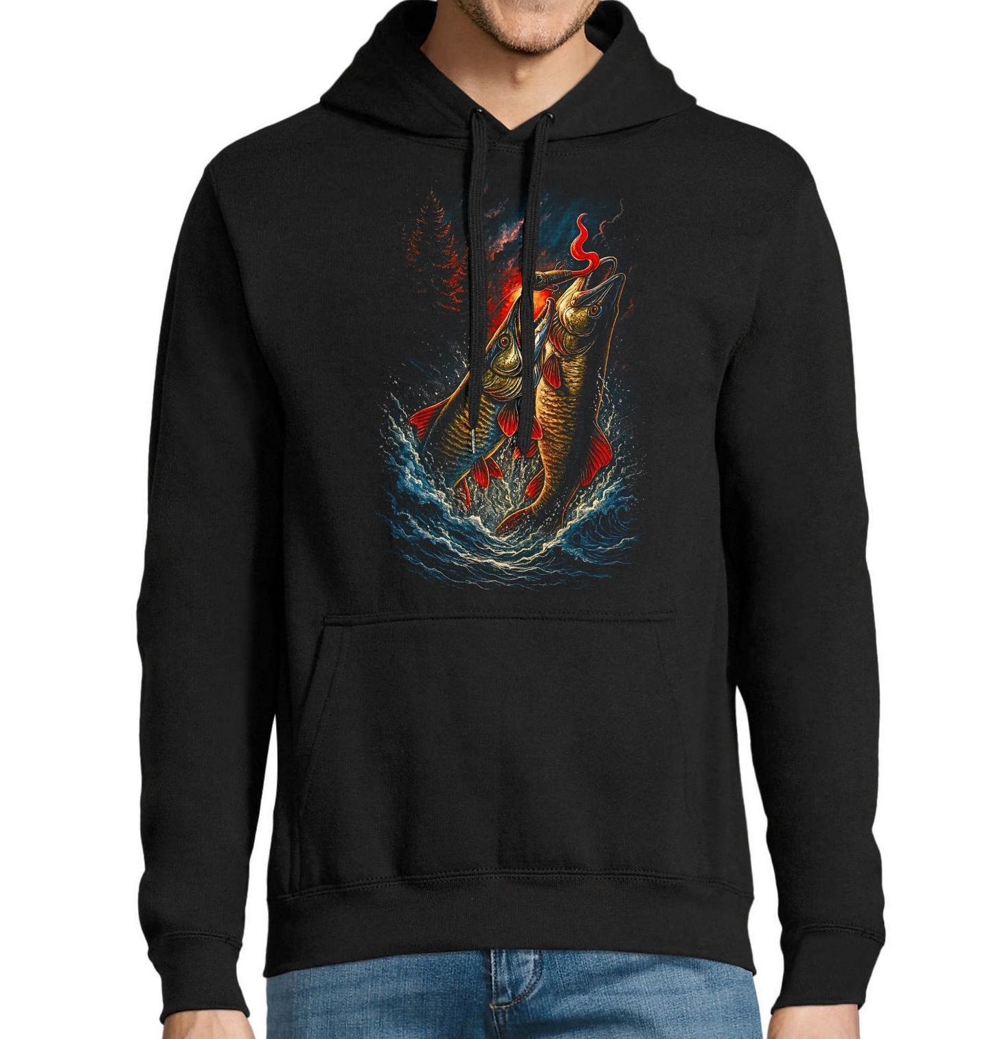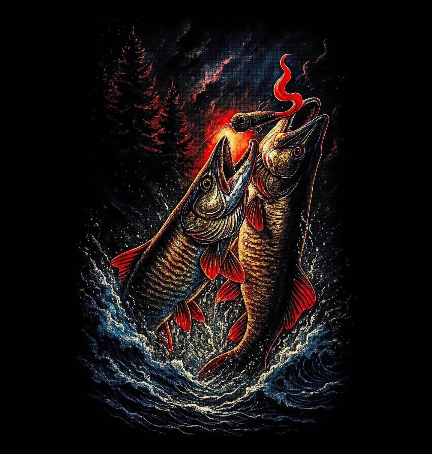 Pánská mikina Lov Štiky obecné. Štika obecná, dravec sladkých vod, ve chvíli, kdy dvě štiky současně útočí na jednu nástrahu s háčkem. Exploze vody, otevřené tlamy a tvrdý souboj o kořist vystihují přesně ten moment, který dělá rybaření tak návykovým. Tento motiv ocení každý rybář, který miluje lov štik, přívlač a situace, kdy rozhoduje rychlost, instinkt a správná volba nástrahy.