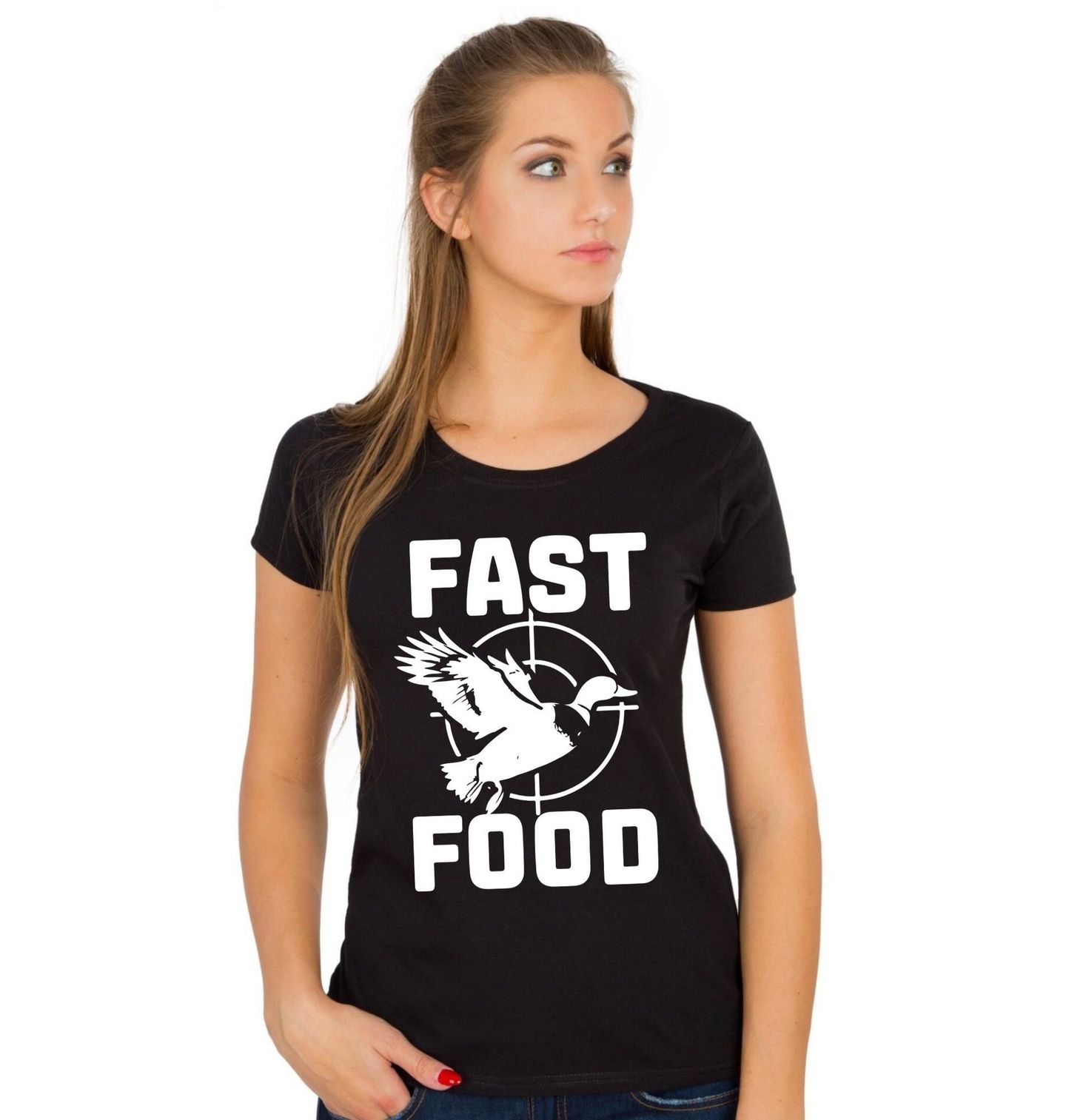Dámské tričko Lovec a jeho Fast Food. Výrazný motiv s letící kachnou v zaměřovacím kříži symbolizující lov a humor mysliveckého života. Na obrázku je text "Fast Food", což v překladu znamená "Rychlé občerstvení". Design kombinuje lovecké téma s nadsázkou a je ideální pro myslivce, lovce vodního ptactva nebo fanoušky outdoorových aktivit.