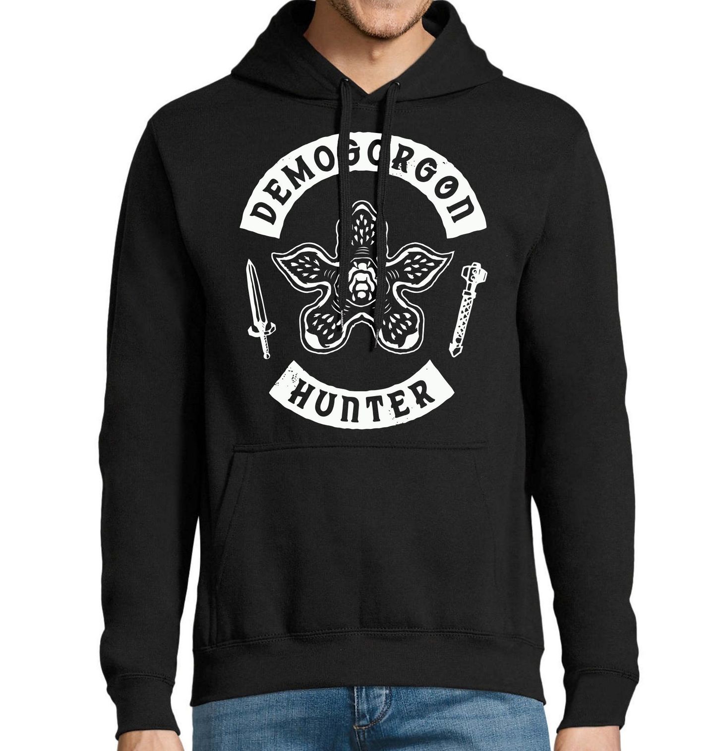 Pánská mikina Lovec Demogorgonů. Temný design inspirovaný seriálem Stranger Things zobrazuje ikonickou příšeru Demogorgona a nápis „Demogorgon Hunter“, což znamená „Lovec Demogorgonů“. Motiv doplněný mečem a pálkou působí jako znak odvážného lovce monster a je ideální pro fanoušky tohoto příběhu.