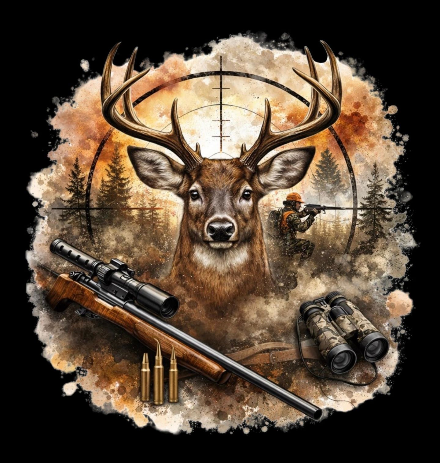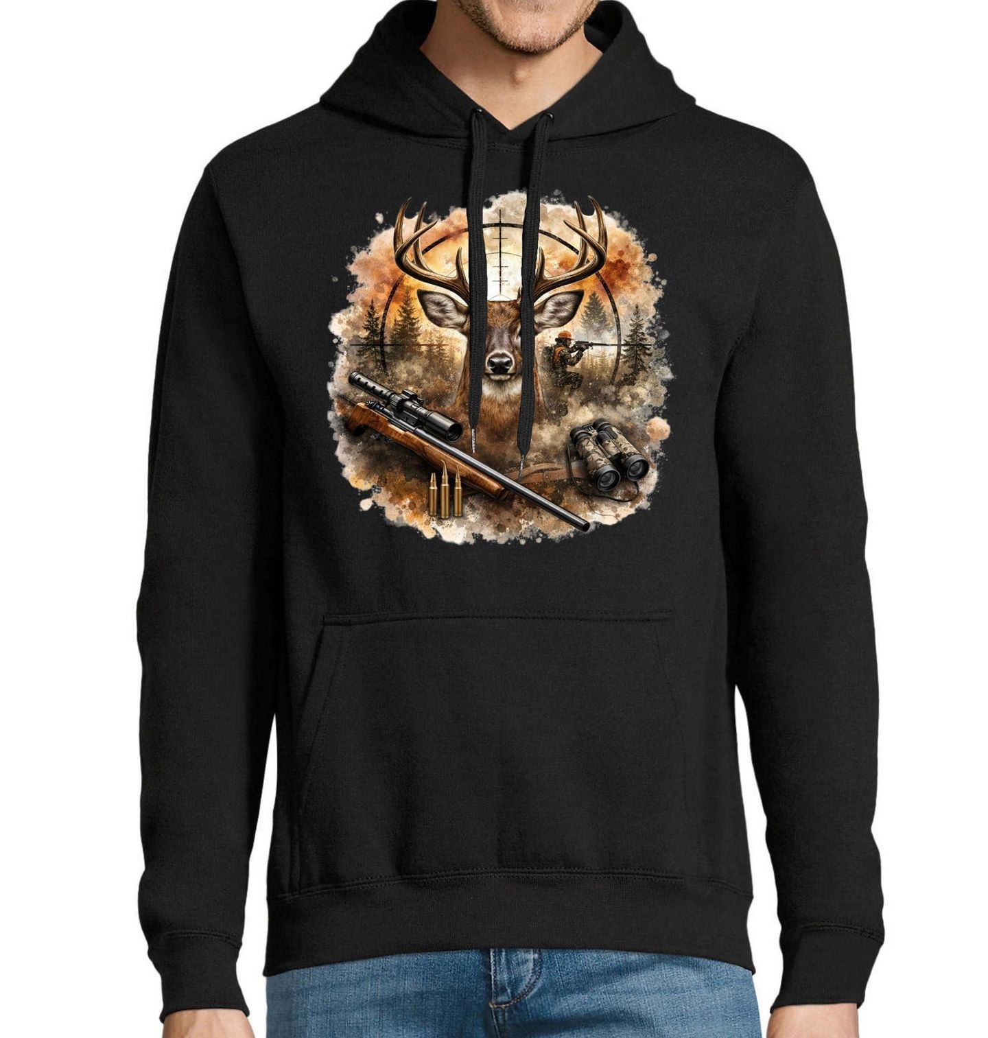 Pánská mikina Lovec Jelenů. Detailní design s jelenem, puškou a loveckým vybavením osloví každého nadšence do přírody. Motiv symbolizuje lov, myslivost a divokou zvěř. Ideální tričko pro lovce, outdoor nadšence a milovníky lesa.