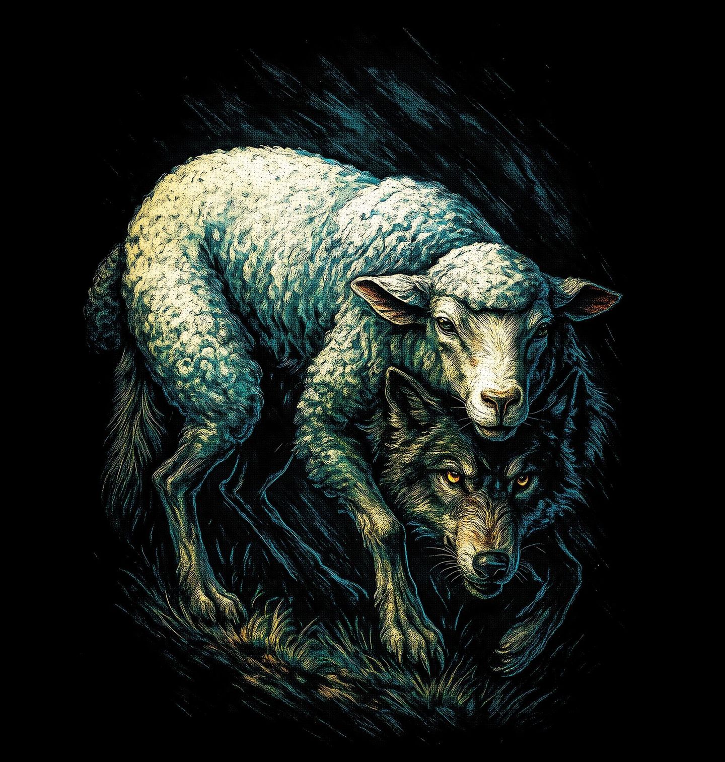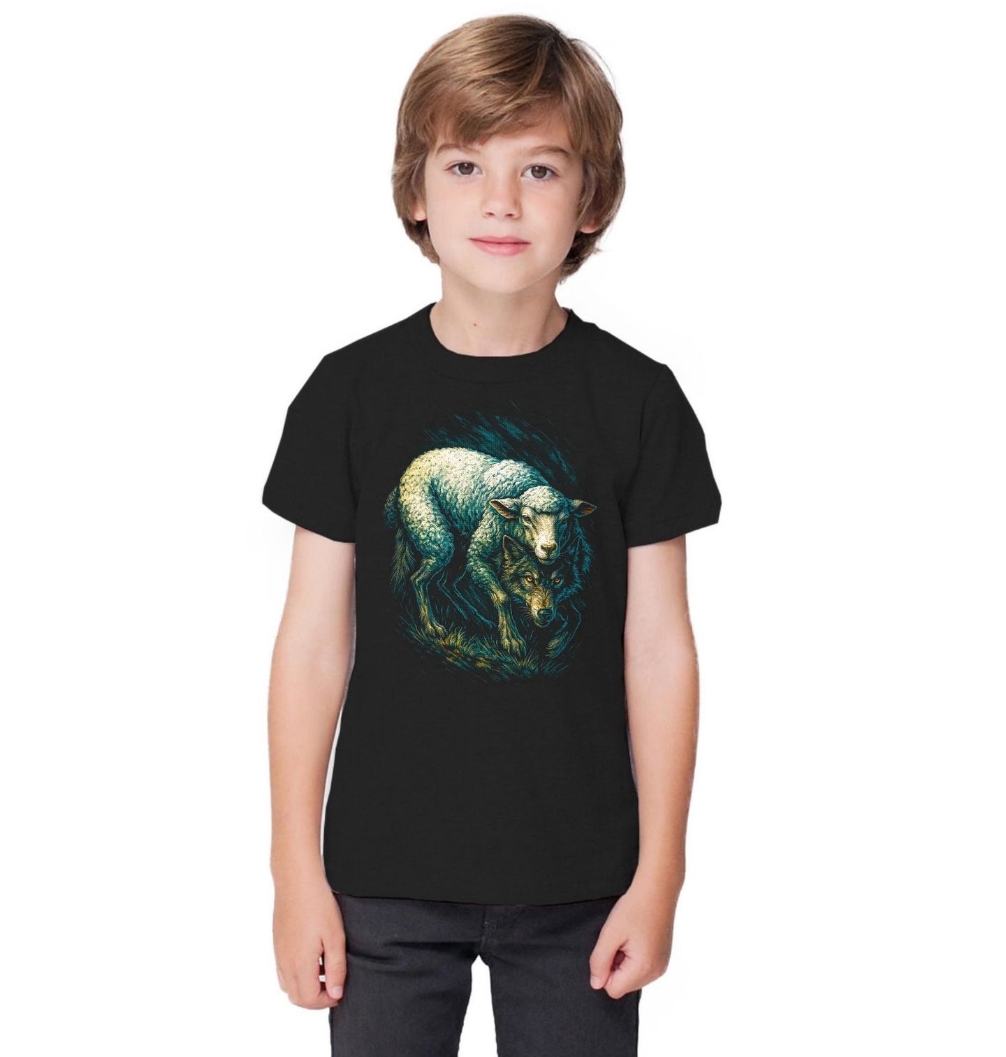 Dětské tričko Lstivý Vlk v Přestrojení. Na první pohled nevinná ovce, která skrývá pravou tvář – dravý vlk, připravený proniknout mezi ostatní. Tento design dokonale vystihuje známé rčení o tom, že ne všechno je takové, jak se zdá. Motiv vlk a ovce v jednom obraze vytváří jedinečný kontrast mezi nevinností a nebezpečím. Vlk zde představuje inteligenci, strategii a sílu, zatímco ovce symbolizuje masku, díky které se vlk dostane mezi ostatní bez podezření.