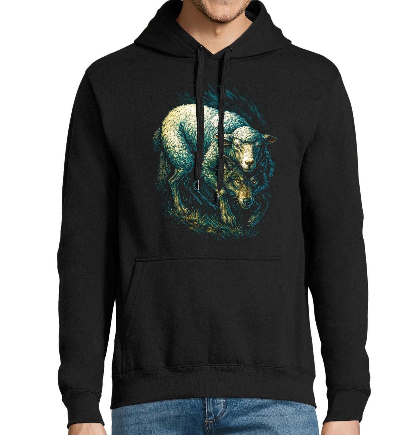 Pánská mikina Lstivý Vlk v Přestrojení. Na první pohled nevinná ovce, která skrývá pravou tvář – dravý vlk, připravený proniknout mezi ostatní. Tento design dokonale vystihuje známé rčení o tom, že ne všechno je takové, jak se zdá. Motiv vlk a ovce v jednom obraze vytváří jedinečný kontrast mezi nevinností a nebezpečím. Vlk zde představuje inteligenci, strategii a sílu, zatímco ovce symbolizuje masku, díky které se vlk dostane mezi ostatní bez podezření.