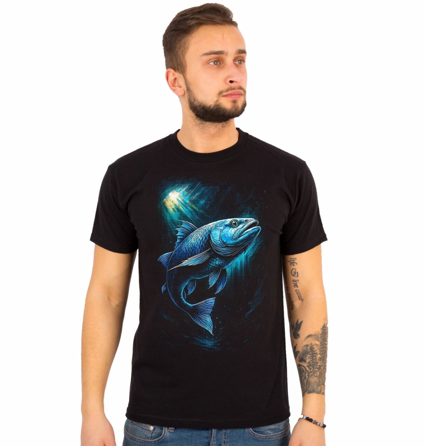 Pánské tričko Lufara dravá. Tento dynamický motiv zobrazuje Pomatomus saltatrix, jednoho z nejagresivnějších mořských predátorů. Silné, hydrodynamické tělo a výrazná tlama plná ostrých zubů dělají z této ryby, symbol rychlosti, síly a nekompromisního útoku. Ilustrace zachycuje okamžik napětí pod hladinou, který dobře znají rybáři, pro které je rybaření vášní a výzvou zároveň.