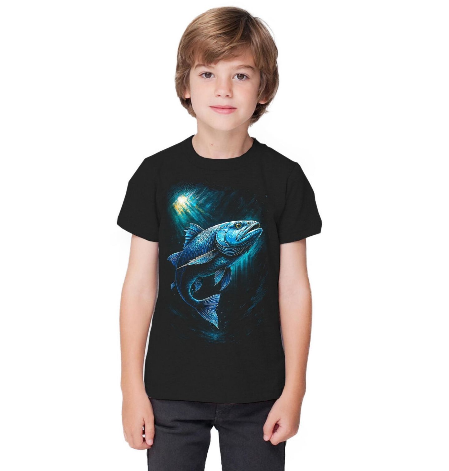 Dětské tričko Lufara dravá. Tento dynamický motiv zobrazuje Pomatomus saltatrix, jednoho z nejagresivnějších mořských predátorů. Silné, hydrodynamické tělo a výrazná tlama plná ostrých zubů dělají z této ryby, symbol rychlosti, síly a nekompromisního útoku. Ilustrace zachycuje okamžik napětí pod hladinou, který dobře znají rybáři, pro které je rybaření vášní a výzvou zároveň.