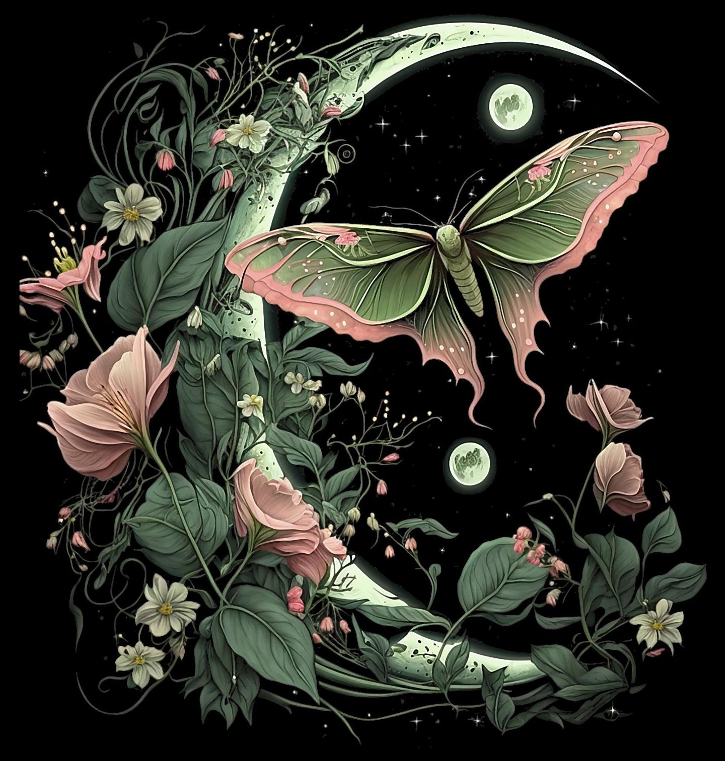 Pánské tričko Lunární Motýl. Tento okouzlující motiv přináší pohádkový svět, kde hlavní roli hraje motýl tančící pod svitem měsíce mezi kvetoucími rostlinami. Nejspíše je to Martináč měsíčitý (Actias luna) - druh motýla z čeledi martináčovití vyskytující se v severní Americe.
