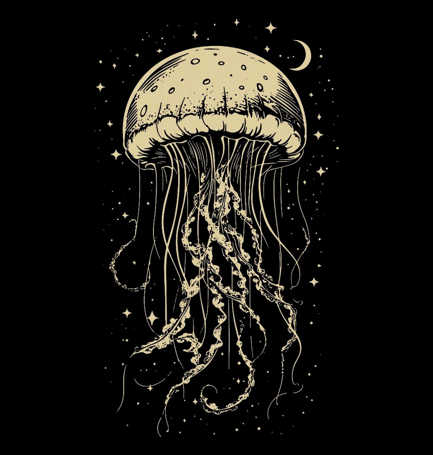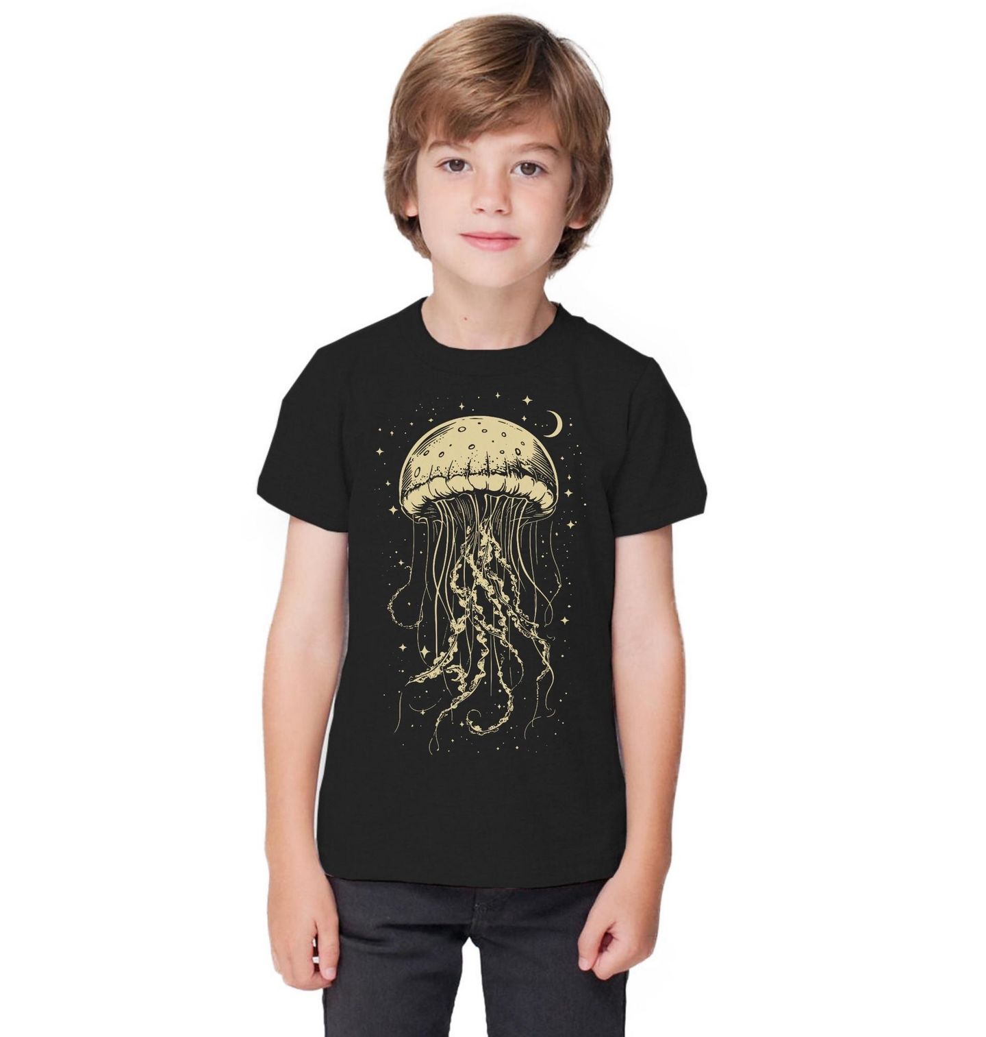 Dětské tričko Magická Medúza mezi Hvězdami. Elegantní ilustrace zobrazuje tajemnou medúzu, která se vznáší v temném prostoru plném hvězd a měsíce. Jemné linie chapadel vytvářejí hypnotický a klidný motiv inspirovaný hlubinami oceánu. Medúza zde symbolizuje krásu, tajemství a klid podmořského světa.