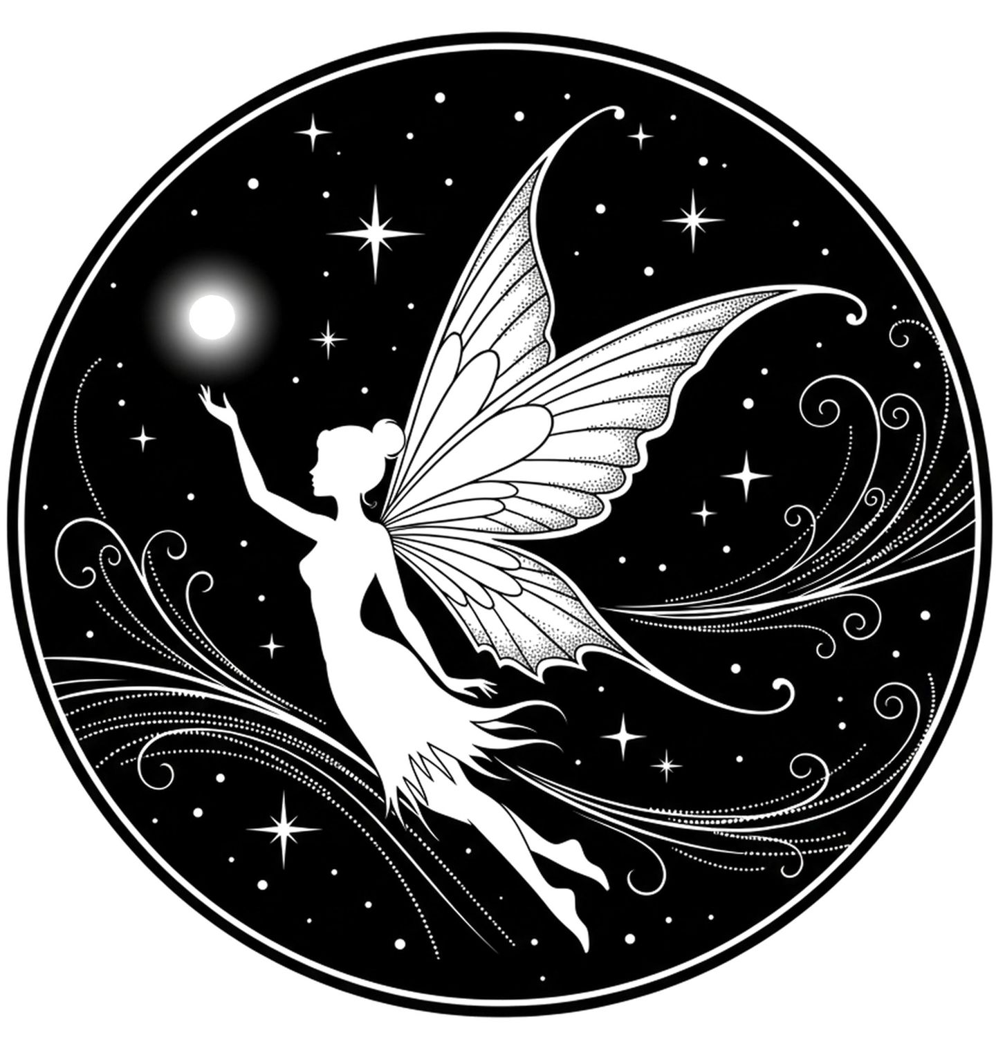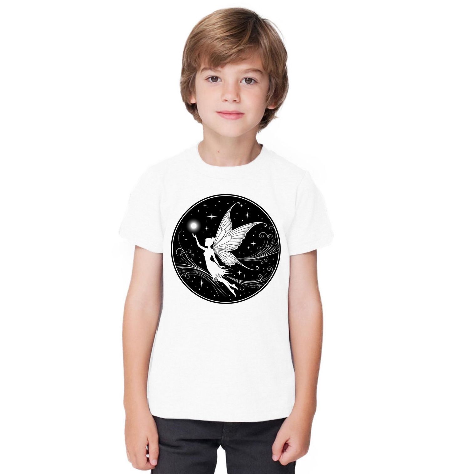 Dětské tričko Magická Víla. Elegantní ilustrace víly v noční obloze plné hvězd vytváří kouzelnou atmosféru. Jemné linie a kontrast černé a bílé podtrhují mystický charakter. Ideální pro milovníky fantasy, víl a magických motivů.