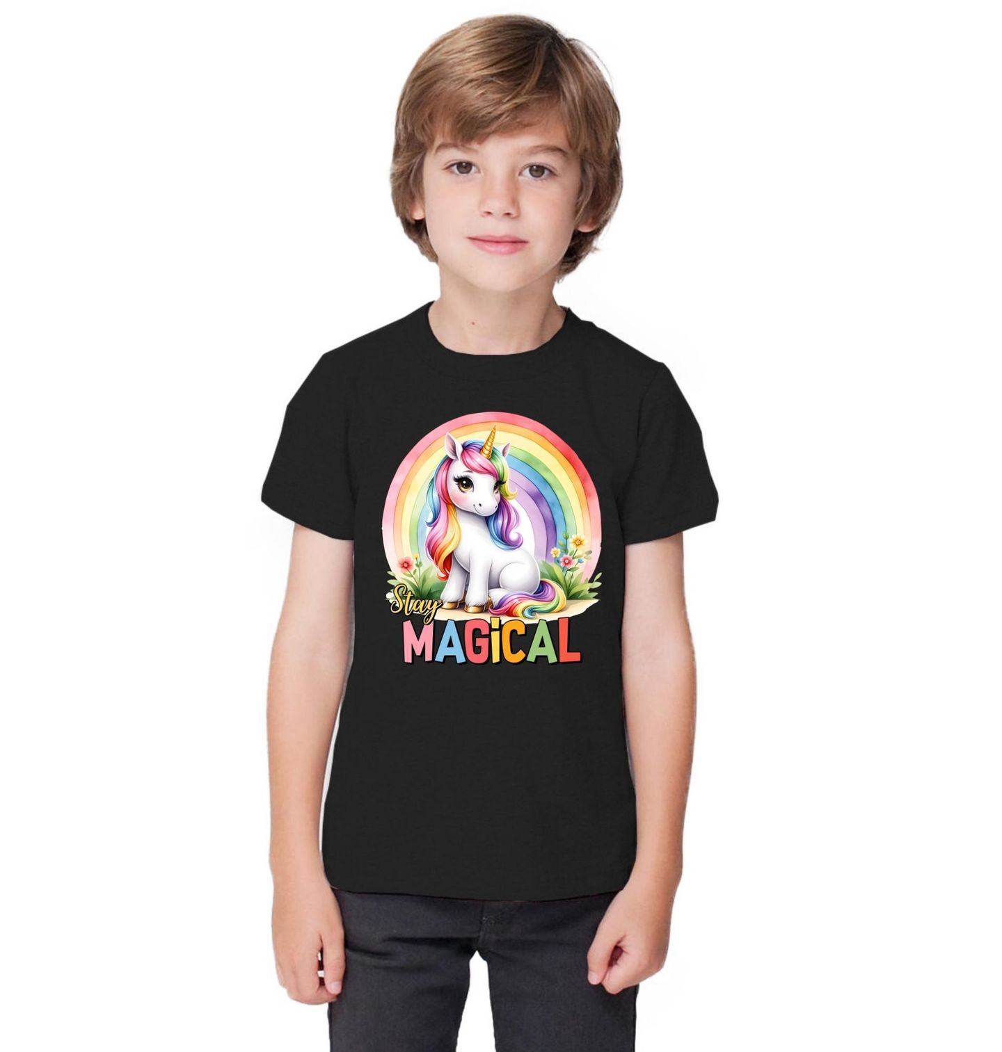 Dětské tričko Magický Jednorožec Stay Magical. Roztomilý a barevný design zachycuje kouzelný svět, kde hlavní roli hraje jednorožec s duhovou hřívou na pozadí zářivé duha. Motiv působí hravě, pozitivně a přináší veselou fantasy atmosféru plnou barev a fantazie. Ideální potisk pro všechny milovníky pohádkového stylu, kteří chtějí dodat outfitu radostnou energii a kouzelný nádech.