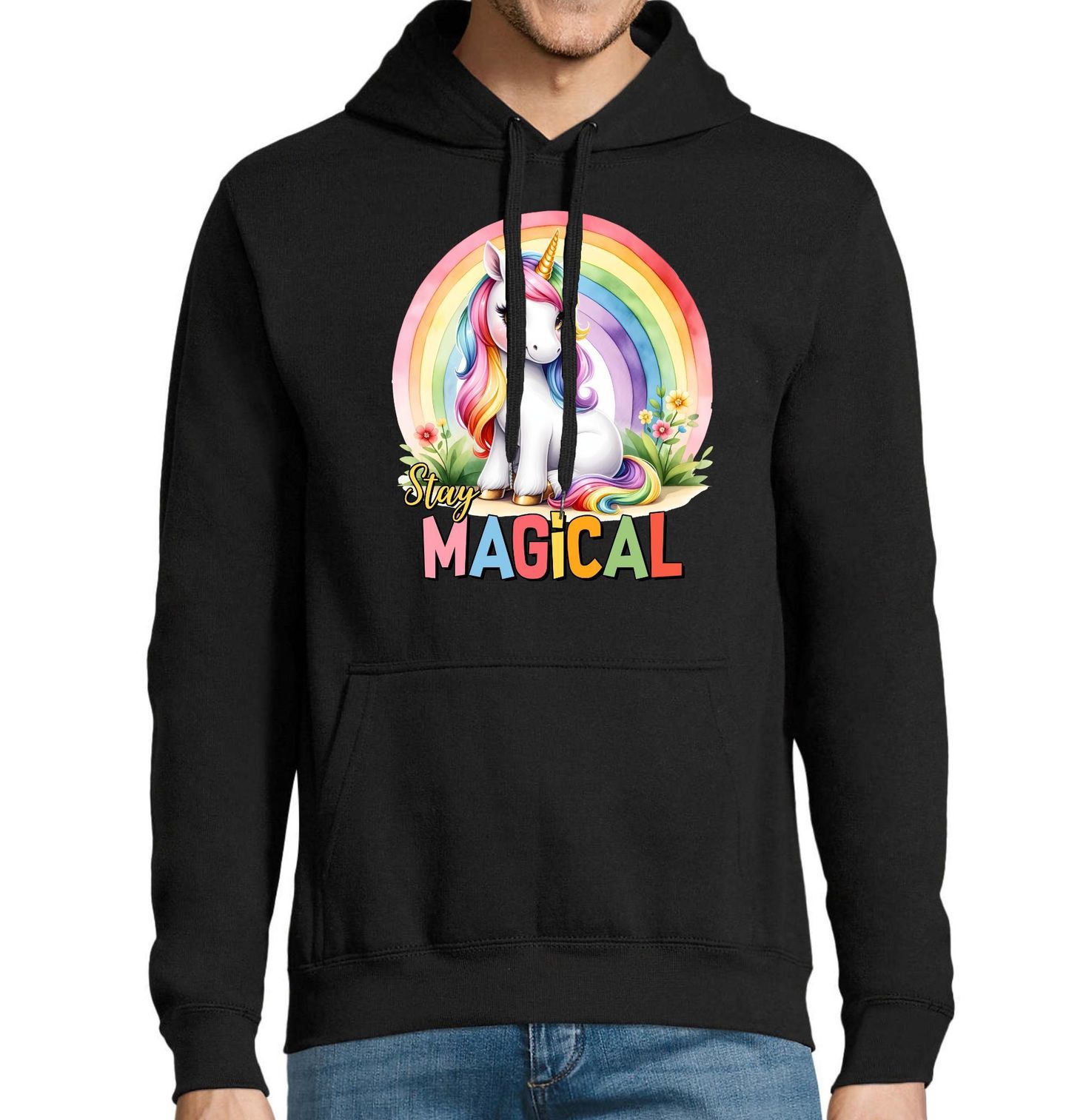Pánská mikina Magický Jednorožec Stay Magical. Roztomilý a barevný design zachycuje kouzelný svět, kde hlavní roli hraje jednorožec s duhovou hřívou na pozadí zářivé duha. Motiv působí hravě, pozitivně a přináší veselou fantasy atmosféru plnou barev a fantazie. Ideální potisk pro všechny milovníky pohádkového stylu, kteří chtějí dodat outfitu radostnou energii a kouzelný nádech.