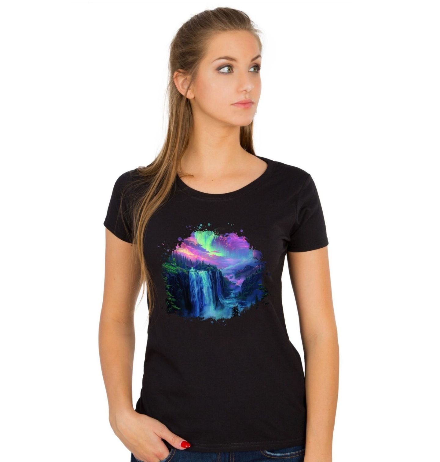 Dámské tričko Magický Vodopád a Polární Záře. Tento nádherný motiv jako z pohádky zachycuje mohutný vodopád, který se řítí z vysokých skal a ztrácí se v mlžném údolí. Kolem se rozkládá hluboký les plný temně zelených stromů a celé scenérii dominuje mystická obloha v odstínech fialové a tyrkysové – jako by nad krajinou zářila polární záře.