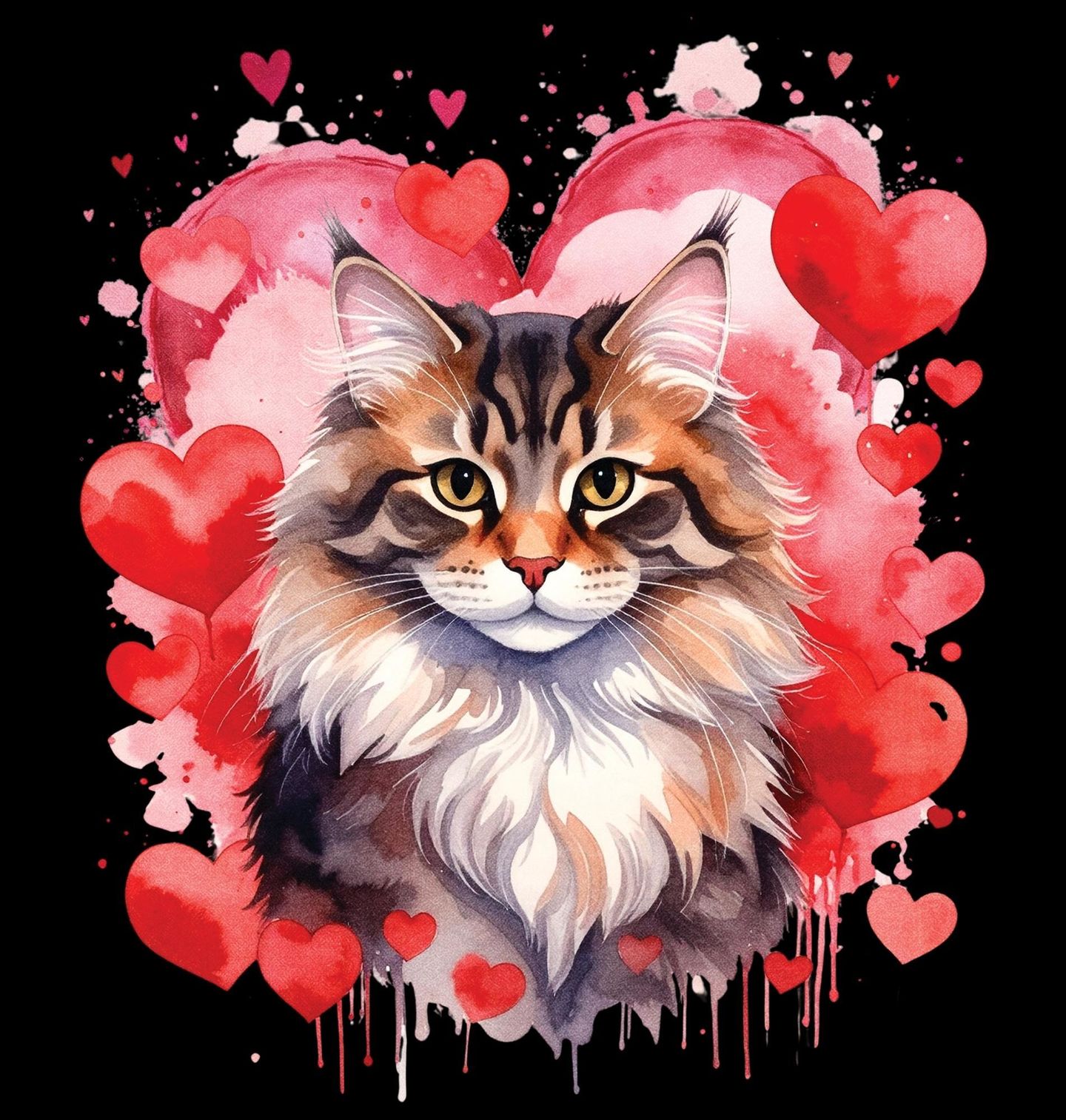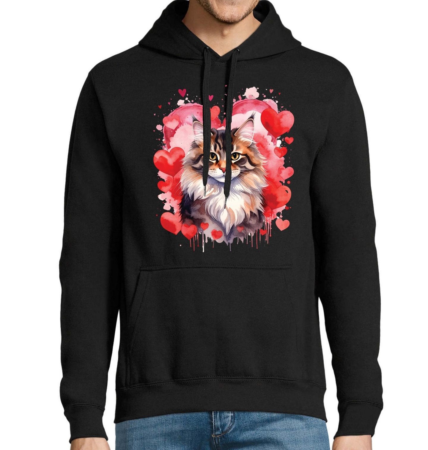 Pánská mikina Mainská mývalí Kočka mezi Srdci. Motiv nejvíce odpovídá Mainská mývalí kočka (Maine Coon) – poznat ji lze podle bohaté srsti, výrazného límce kolem krku, větších uší a majestátního vzhledu. Jde o jedno z nejoblíbenějších a nejcharakterističtějších plemen. Kočka v tomto provedení působí hrdě, něžně a zároveň elegantně, což z motivu dělá ideální volbu pro milovníky koček a romantických designů.