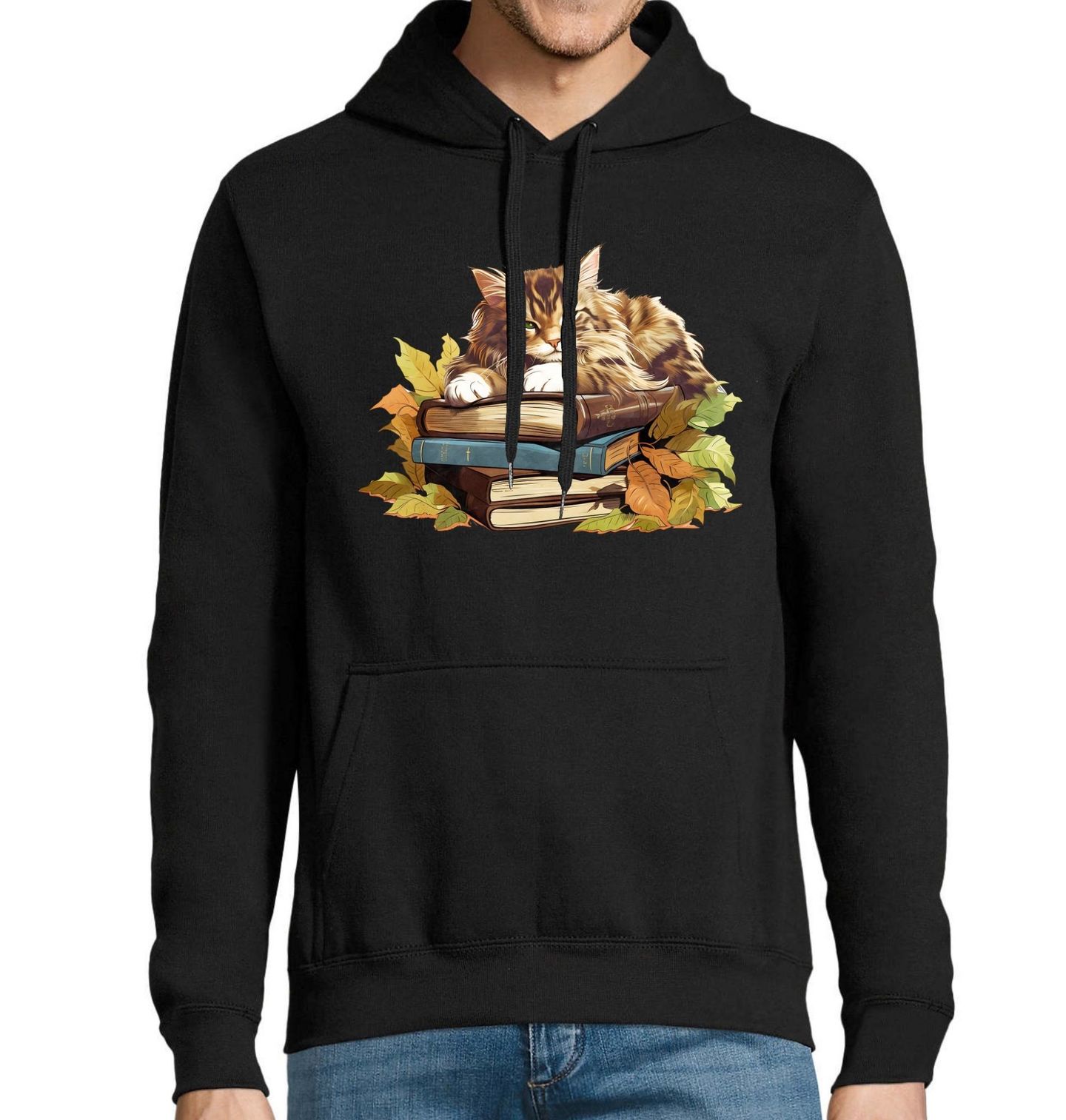 Pánská mikina Mainská mývalí Kočka na Knihách. Elegantní kočka odpočívající na hromadě knihy vytváří jedinečný motiv spojující lásku ke čtení, klid a kočičí moudrost. Detailně zpracovaná ilustrace zachycuje dlouhosrstou mainskou kočka, která působí klidně, sebevědomě a lehce tajemně. Design se skvěle hodí jako dárek pro čtenáře, knihomoly i každého, kdo vnímá knihy jako útočiště a kočka jako jejich tichého strážce.