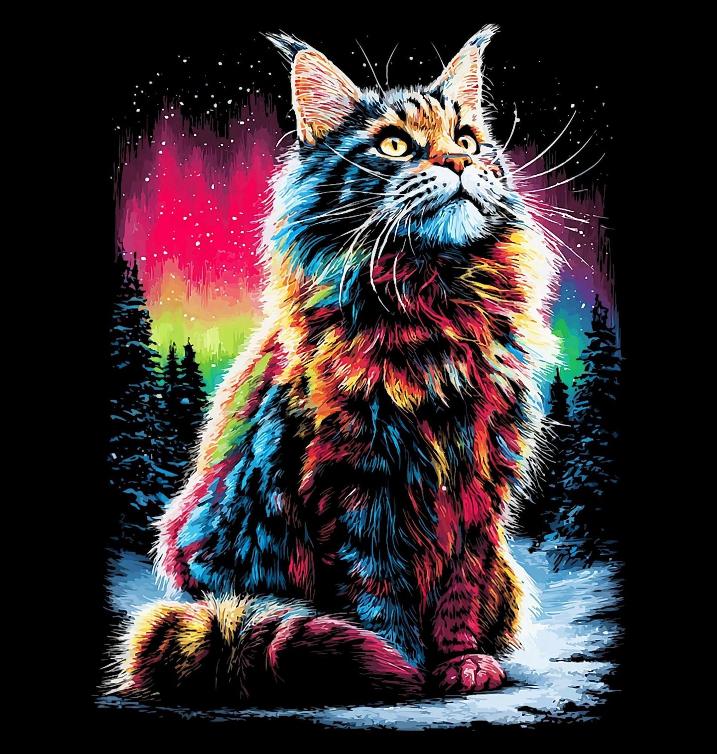 Dětské tričko Mainská Mývalí Kočka pod Polární Září. Na motivu je majestátní dlouhosrstá kočka, konkrétně mainská mývalí kočka (Maine Coon), která sedí uprostřed zimní krajiny. Kolem ní leží třpytivý sníh a nad lesem září nádherná polární záře v sytých barvách. Srst kočky odráží barvy oblohy, což vytváří magický a snový efekt.