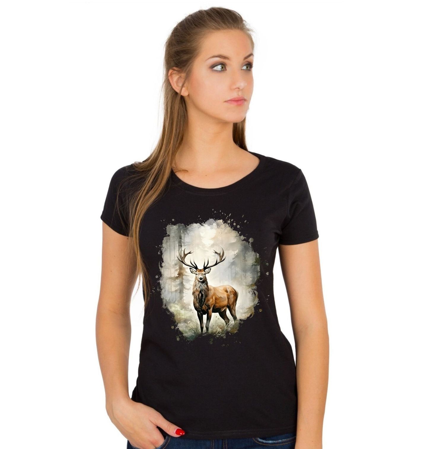 Dámské tričko Majestátní Jelen evropský. Motiv zachycuje jelena lesního (Cervus elaphus), největší a nejmajestátnější druh jelena žijící v Evropě. Tento jelen je symbolem síly, klidu a přirozené rovnováhy, kterou představuje tichý a rozlehlý les. Jelen lesní obývá především smíšené a horské lesy, kde se pohybuje s přirozenou elegancí a respektem. Dominantní paroží a hrdý postoj z něj činí skutečného krále lesa.