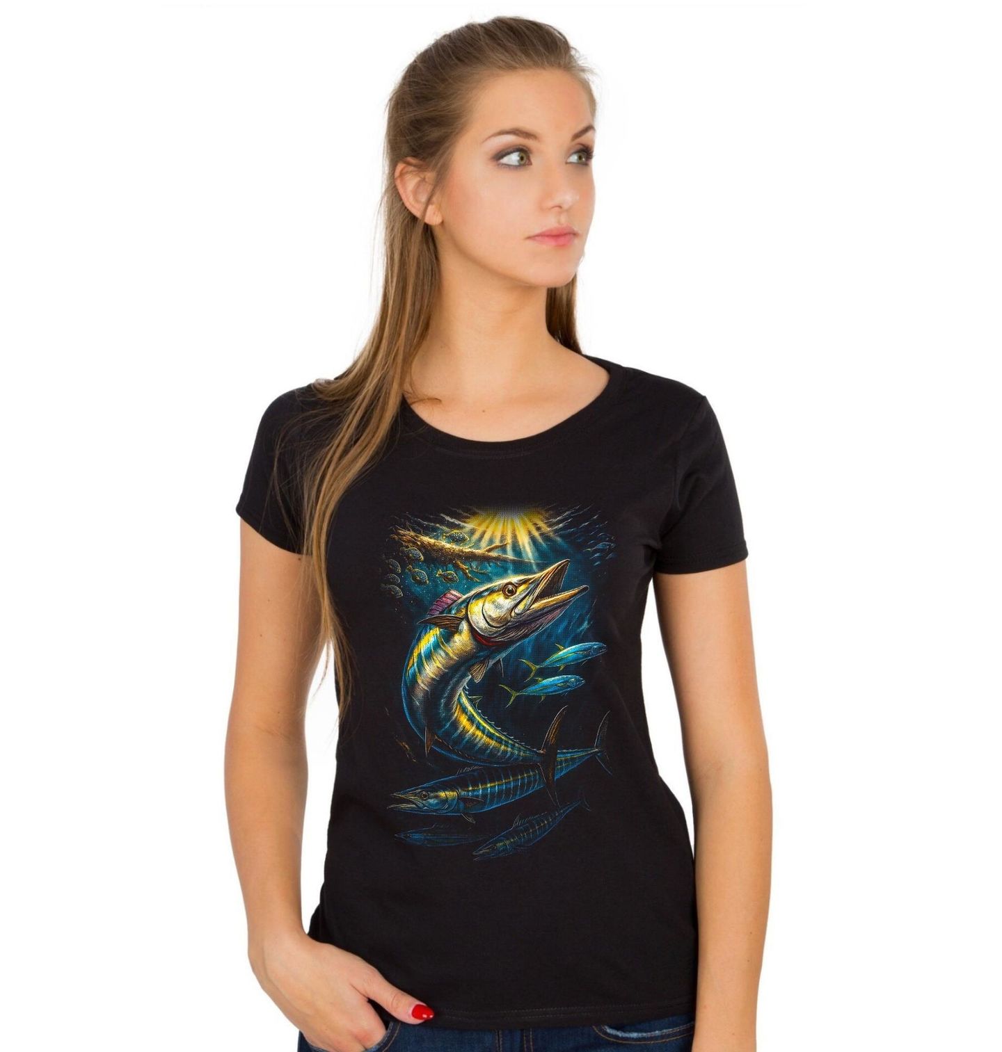 Dámské tričko Makrela Solandrova Wahoo. Rybaření na wahoo patří mezi vrcholné zážitky mořského sportovního lovu. Každý zkušený rybář ví, že po záběru následuje brutální únik a souboj, který prověří vybavení i nervy. Wahoo dokáže útočit v plné rychlosti a její ostré zuby z ní dělají obávaného predátora tropických vod.
