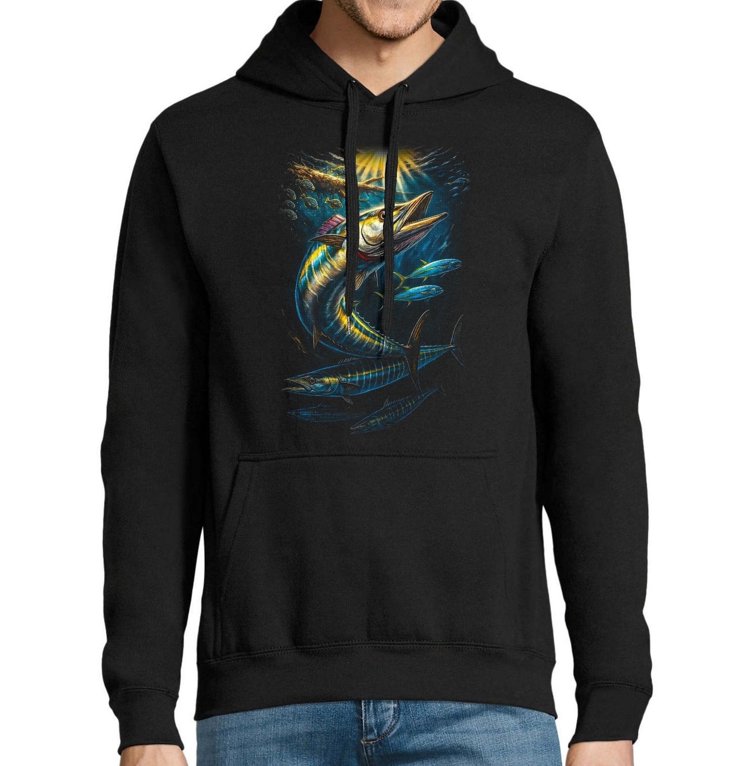 Pánská mikina Makrela Solandrova Wahoo. Rybaření na wahoo patří mezi vrcholné zážitky mořského sportovního lovu. Každý zkušený rybář ví, že po záběru následuje brutální únik a souboj, který prověří vybavení i nervy. Wahoo dokáže útočit v plné rychlosti a její ostré zuby z ní dělají obávaného predátora tropických vod.