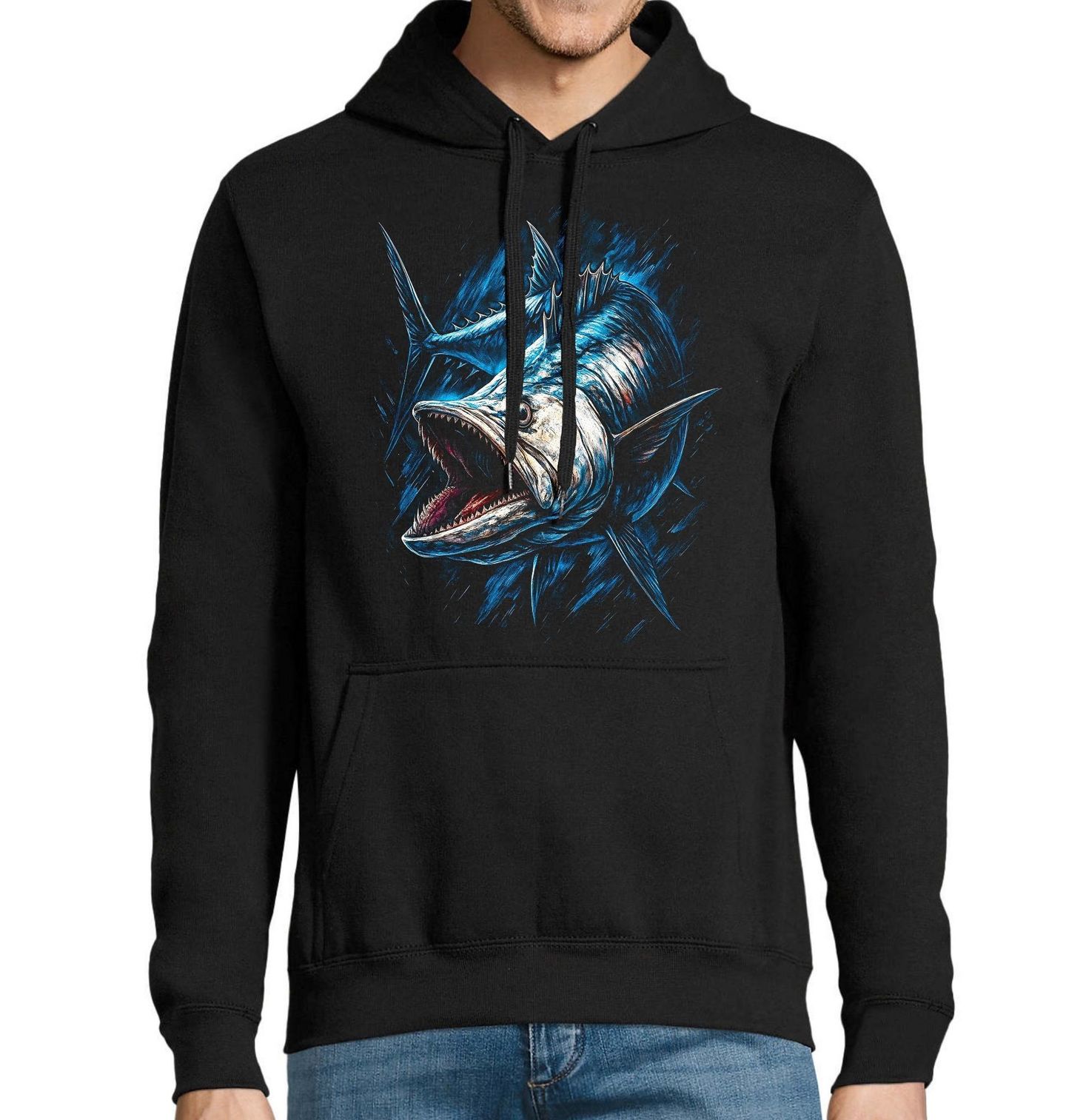 Pánská mikina Makrela španělská. Dynamický a nekompromisní motiv makrely španělské zachycuje rychlost, sílu a dravost jednoho z nejrespektovanějších mořských lovců. Tento design je stvořený pro každého, kdo bere rybaření vážně a má respekt k oceánu. Ideální volba pro každého, kdo se hrdě hlásí k tomu, že je rybář, a chce to dát najevo stylem.