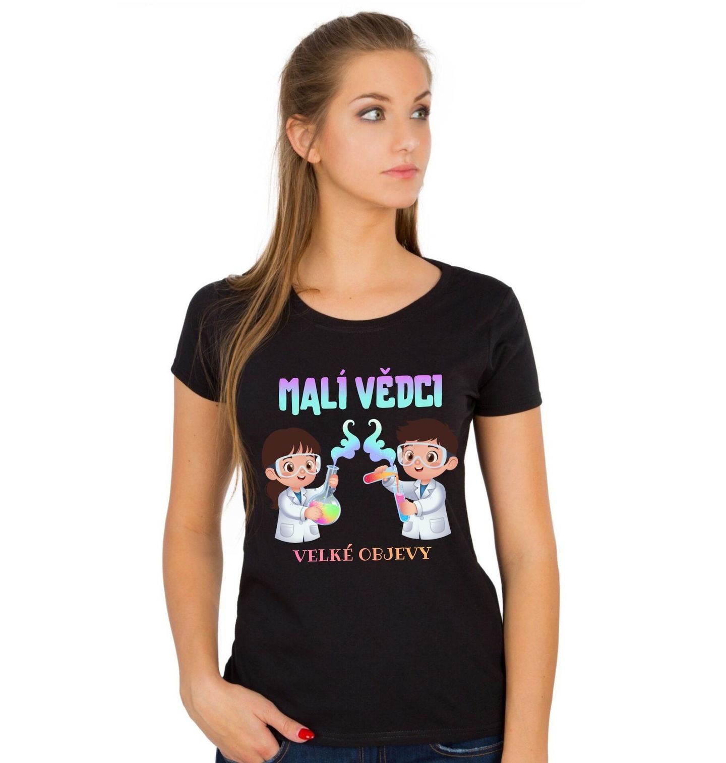 Dámské tričko Malí vědci – Velké objevy. Motiv je perfektní jako dárek pro malé badatele, budoucí vědce nebo školáky, které baví chemie a experimentování. Skvěle se hodí do školy, na kroužek nebo jen tak pro radost. Barevné laboratorní baňky a usměvaví malí výzkumníci dodávají motivu pozitivní energii a podporují lásku k vědě.