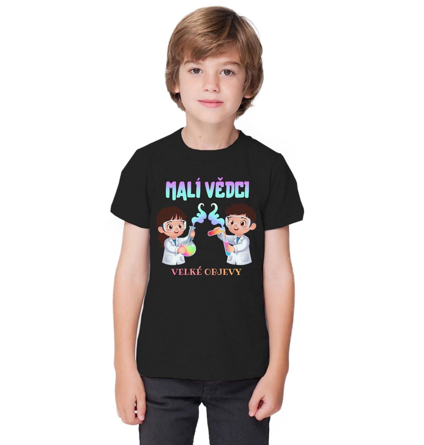 Dětské tričko Malí vědci – Velké objevy. Motiv je perfektní jako dárek pro malé badatele, budoucí vědce nebo školáky, které baví chemie a experimentování. Skvěle se hodí do školy, na kroužek nebo jen tak pro radost. Barevné laboratorní baňky a usměvaví malí výzkumníci dodávají motivu pozitivní energii a podporují lásku k vědě.