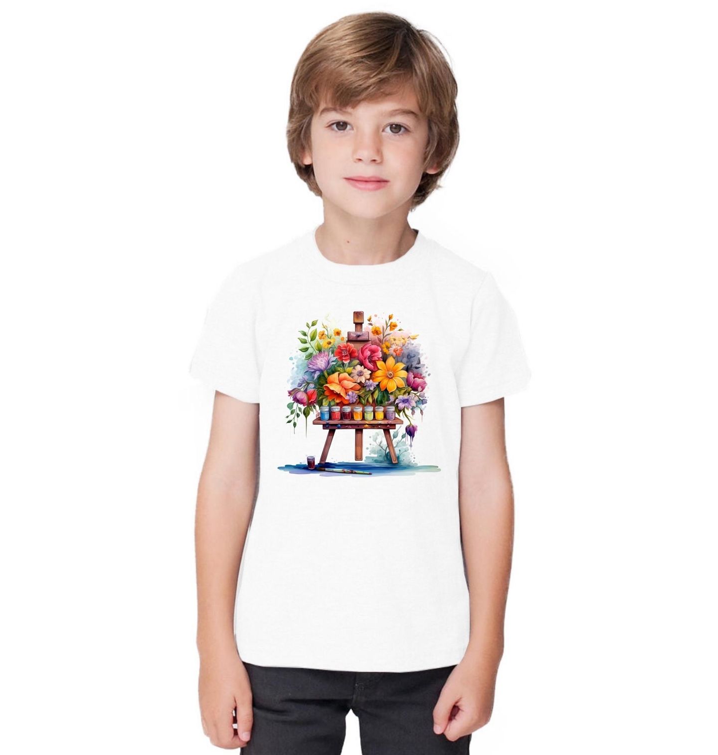 Dětské tričko Malířovo Plátno Květin. Objevte kouzlo, které vzniká, když se malíř spojí s přírodou. Tento barevný motiv spojuje vášeň pro umění, krásu květiny a tvořivost malíře v jeden poetický obraz. Malířské plátno rozkvétá jako jarní zahrada, barvy v kelímcích přímo vybízejí k tvorbě a celý motiv působí jako oslava života, tvořivosti a svobody.