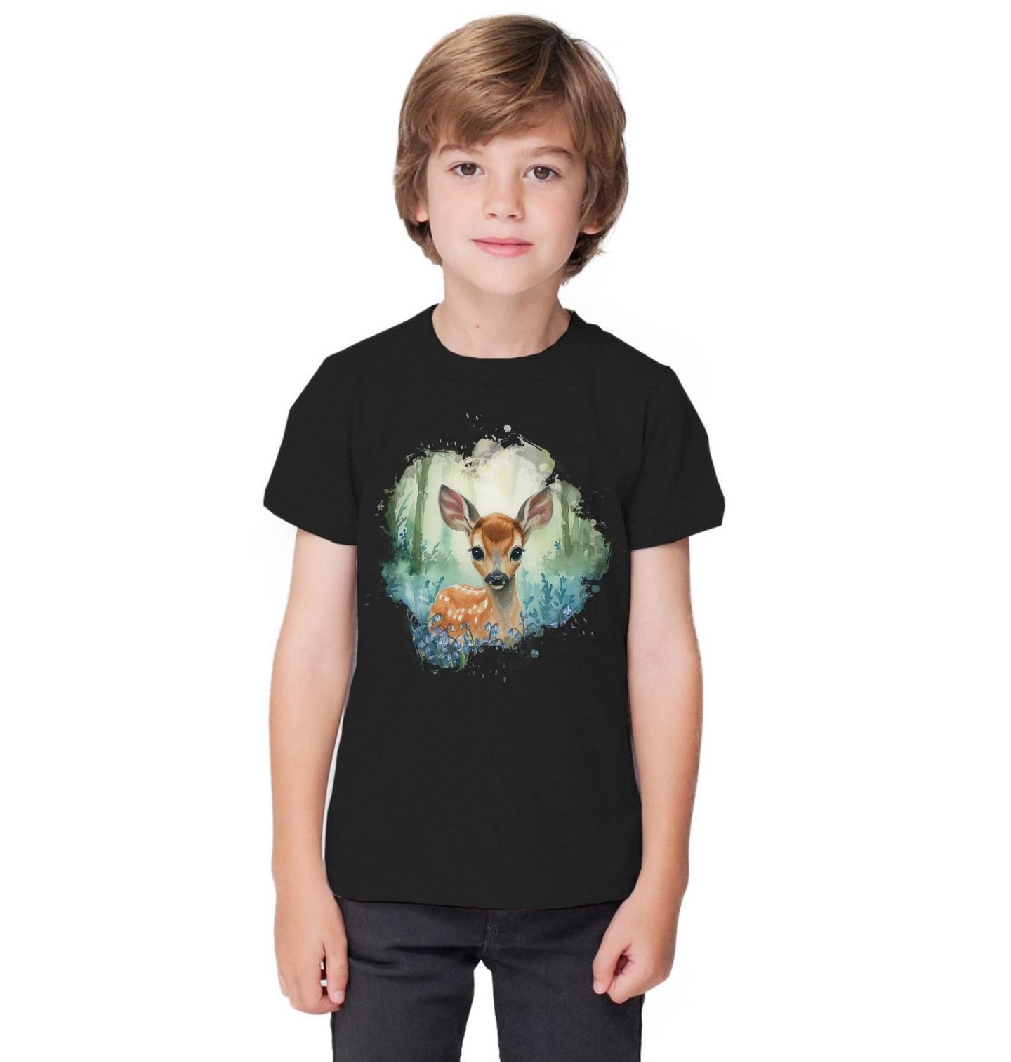 Dětské tričko Malý Koloušek v Lese. Něžný akvarelový motiv zachycuje mladého koloucha, který se tiše dívá z hlubin les plného zeleně a jemných modrých květů. Tento roztomilý koloušek působí klidně, nevinně a pohádkově, jako by byl součástí kouzelného příběhu z přírody. Ilustrace symbolizuje spojení se světem lesa, kde jelen představuje moudrost, klid a harmonii.