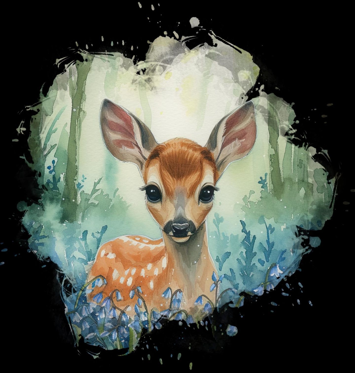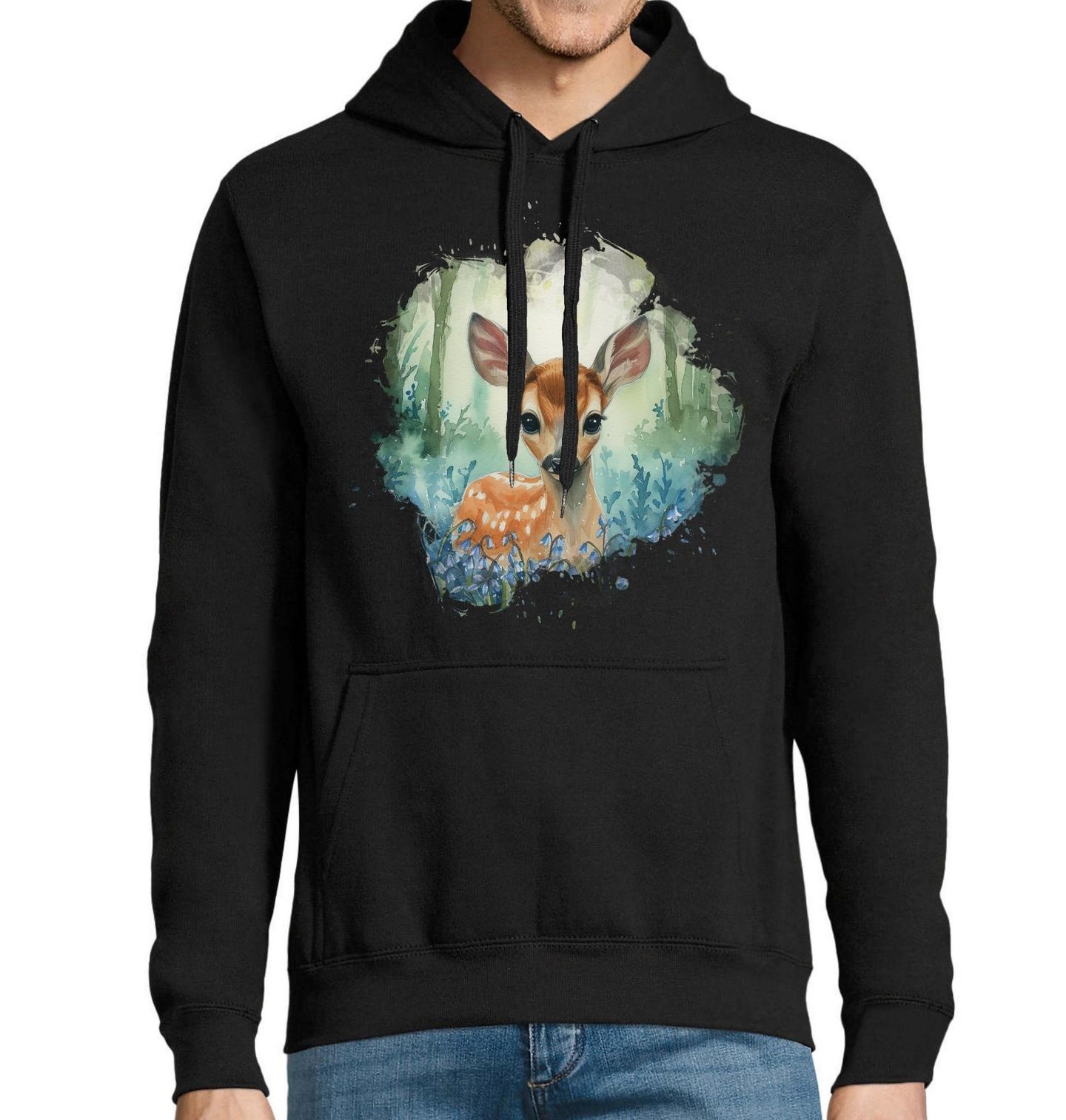 Pánská mikina Malý Koloušek v Lese. Něžný akvarelový motiv zachycuje mladého koloucha, který se tiše dívá z hlubin les plného zeleně a jemných modrých květů. Tento roztomilý koloušek působí klidně, nevinně a pohádkově, jako by byl součástí kouzelného příběhu z přírody. Ilustrace symbolizuje spojení se světem lesa, kde jelen představuje moudrost, klid a harmonii.
