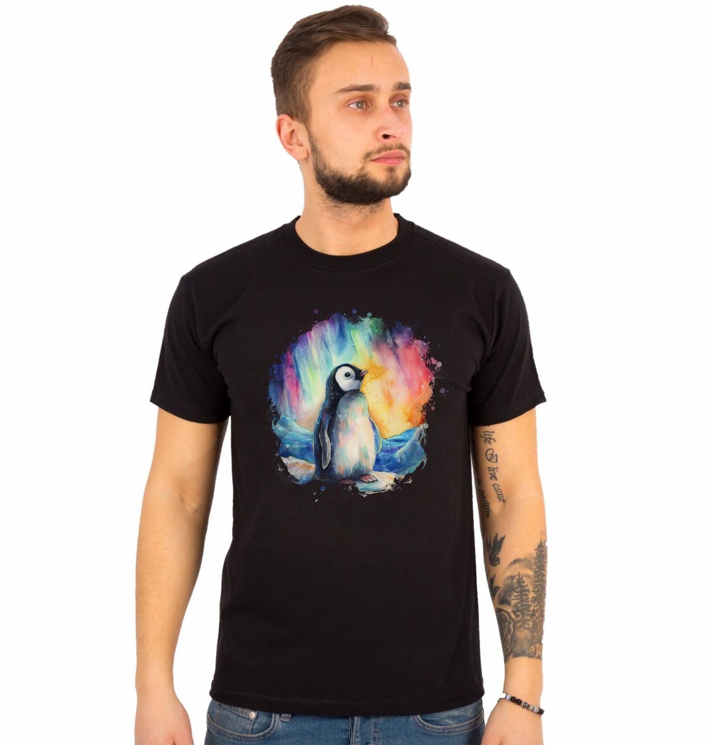 Pánské tričko Malý Tučňák pod Polární Září. Tento roztomilý motiv vypráví pohádku o tom, jak tučňák objevil svět plný barev, ticha a kouzel. Jemná akvarelová ilustrace zachycuje malého hrdinu, který stojí v ledové krajině a s úžasem pozoruje oblohu rozzářenou barvami, jako by se nebe samo rozhodlo vyprávět příběh. Dominantním prvkem je polární záře, která svou hrou barev vytváří snovou, uklidňující atmosféru.