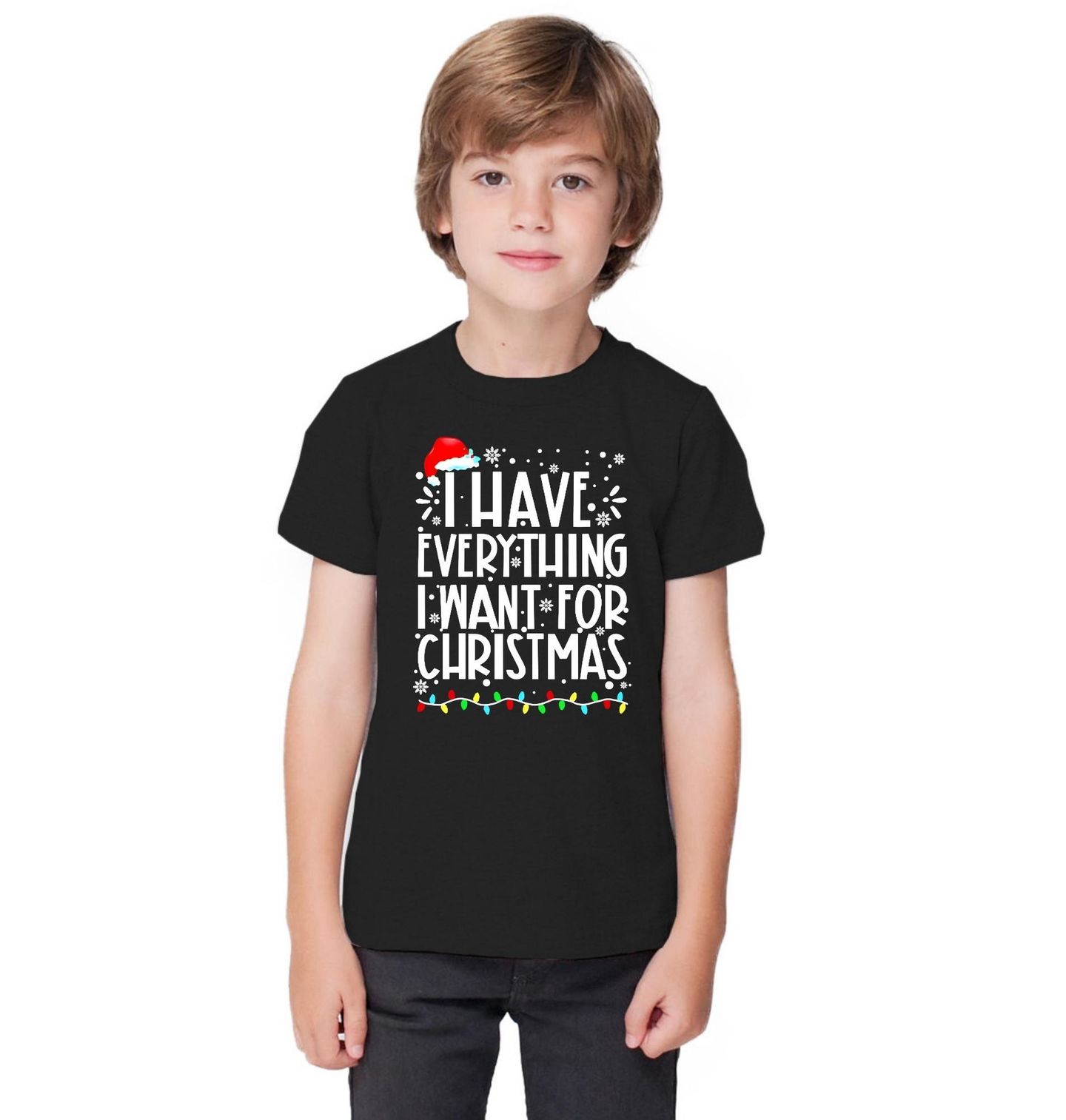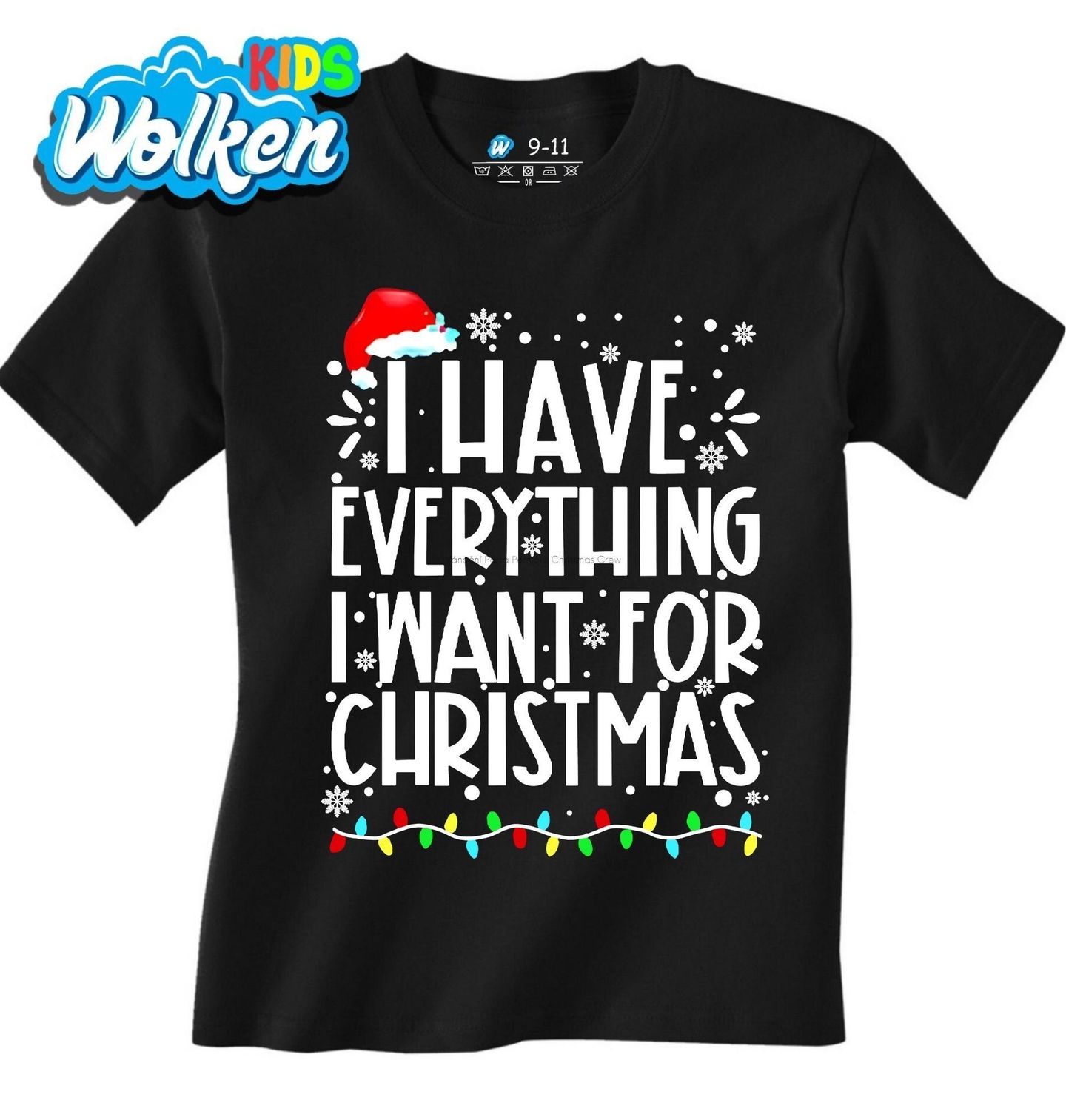 Dětské tričko Mám vše, co chci k Vánocům. Tento krásný vánoční motiv s nápisem „I Have Everything I Want For Christmas“ (česky: „Mám vše, co si k Vánocům přeji“) vyjadřuje radost, klid a vděčnost – přesně to, o čem Vánoce opravdu jsou. Ozdobený vánoční čepičkou, sněhovými vločkami a barevnými světýlky.