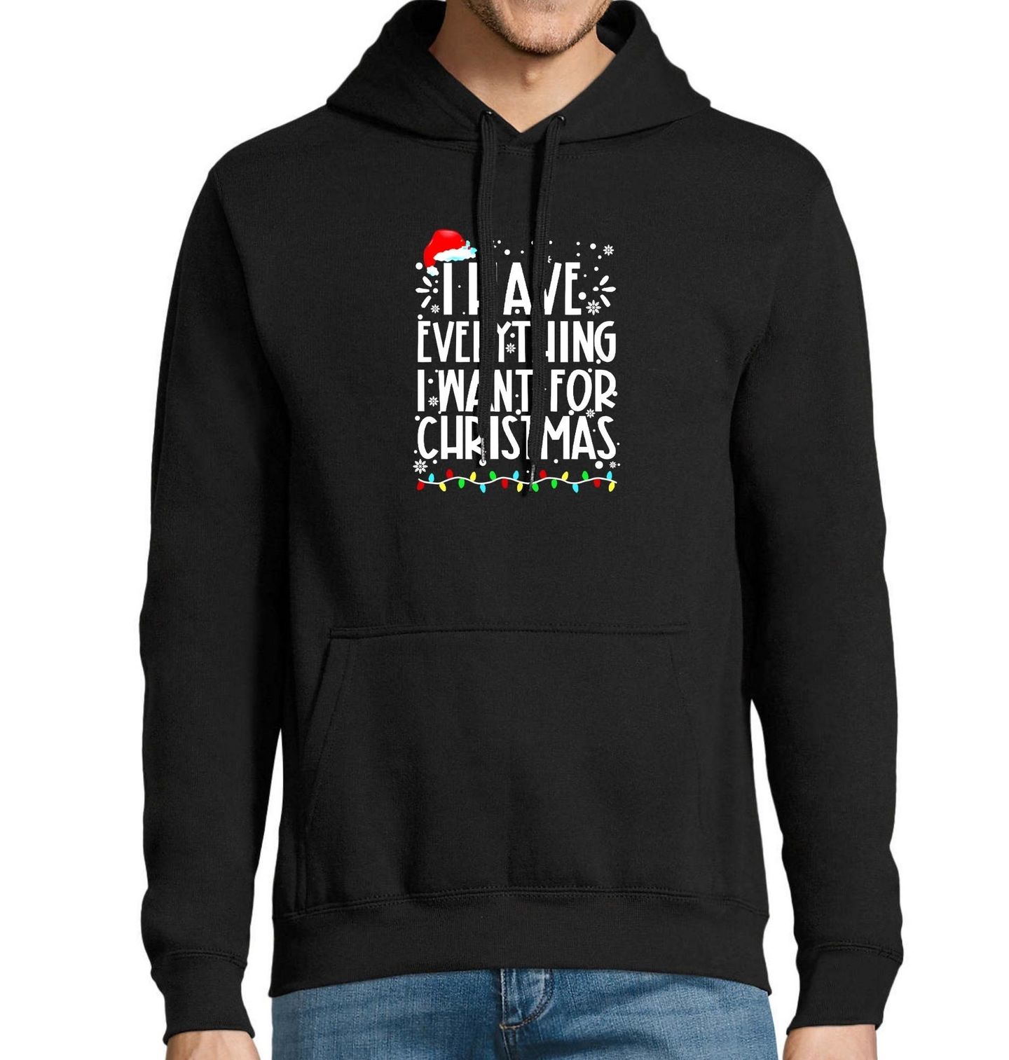 Pánská mikina Mám vše, co chci k Vánocům. Tento krásný vánoční motiv s nápisem „I Have Everything I Want For Christmas“ (česky: „Mám vše, co si k Vánocům přeji“) vyjadřuje radost, klid a vděčnost – přesně to, o čem Vánoce opravdu jsou. Ozdobený vánoční čepičkou, sněhovými vločkami a barevnými světýlky.