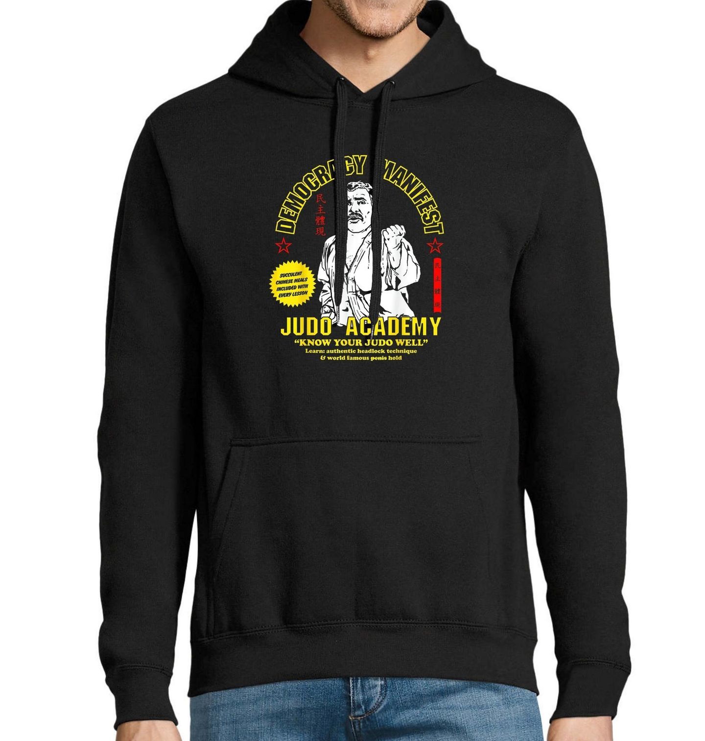 Pánská mikina Manifest demokracie Judo Academy. Motiv vychází z legendárního internetového videa z Austrálie z roku 1991, známého jako: "DEMOCRACY MANIFEST" meme. Je to záznam zatýkání jistého muže (pravděpodobně Jack Karlson), který při zatčení pronesl ikonické hlášky jako: "Know your judo well" v překladu Znáš dobře své judo. Succulent Chinese meals included with every lesson v překladu Šťavnatá čínská jídla v ceně každé lekce.