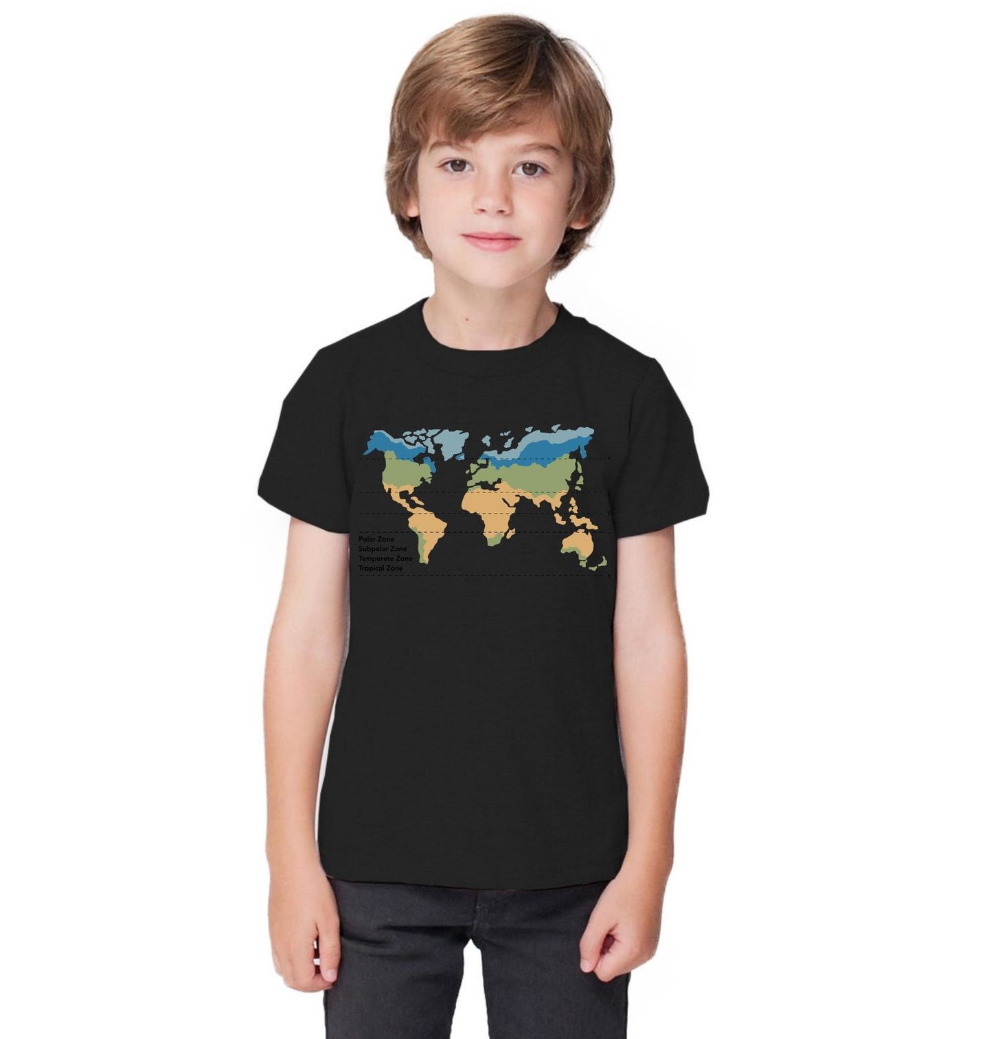 Dětské tričko Mapa světa Klimatické Pásy. Minimalistická a přehledná mapa světa, která znázorňuje hlavní klimatické pásy planety – polární, subpolární, mírný a tropický pás. Klimatické (podnebné) pásy jsou oblasti Země rozdělené podle převládajícího klimatu, teploty a srážek, závislé především na zeměpisné šířce a příjmu slunečního záření.