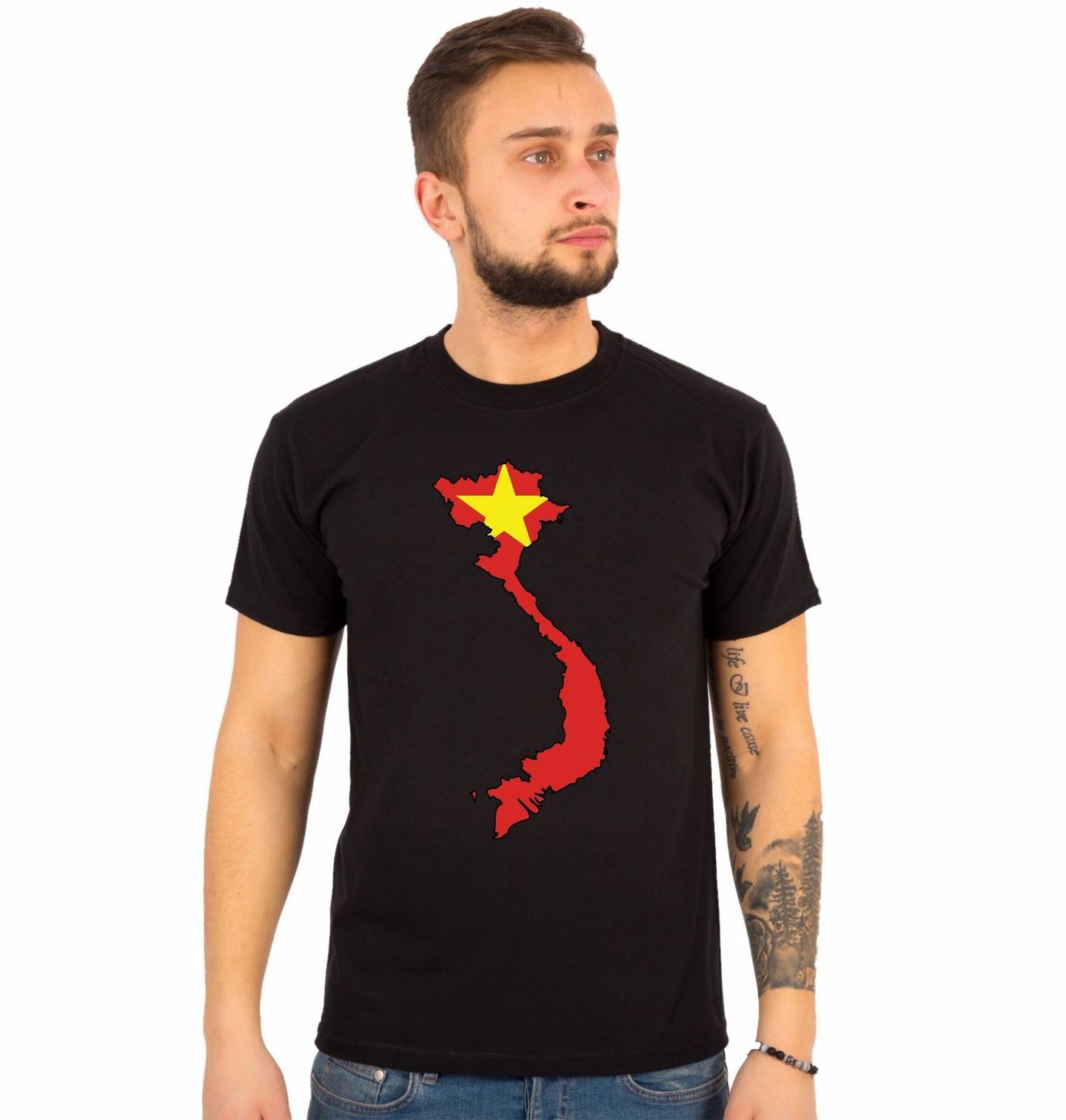 Pánské tričko Mapa Vietnamu. Silný vizuální motiv spojuje tvar, který představuje mapa státu, s barvami a symbolem národní vlajky. Tento design jasně vyjadřuje hrdost, identitu a vztah k zemi, jakou je Vietnam, ležící v srdci regionu Asie. Motiv je ideální pro všechny, kteří mají blízký vztah k Vietnamu – ať už skrze původ, rodinu, cestování nebo obdiv k asijské kultuře.