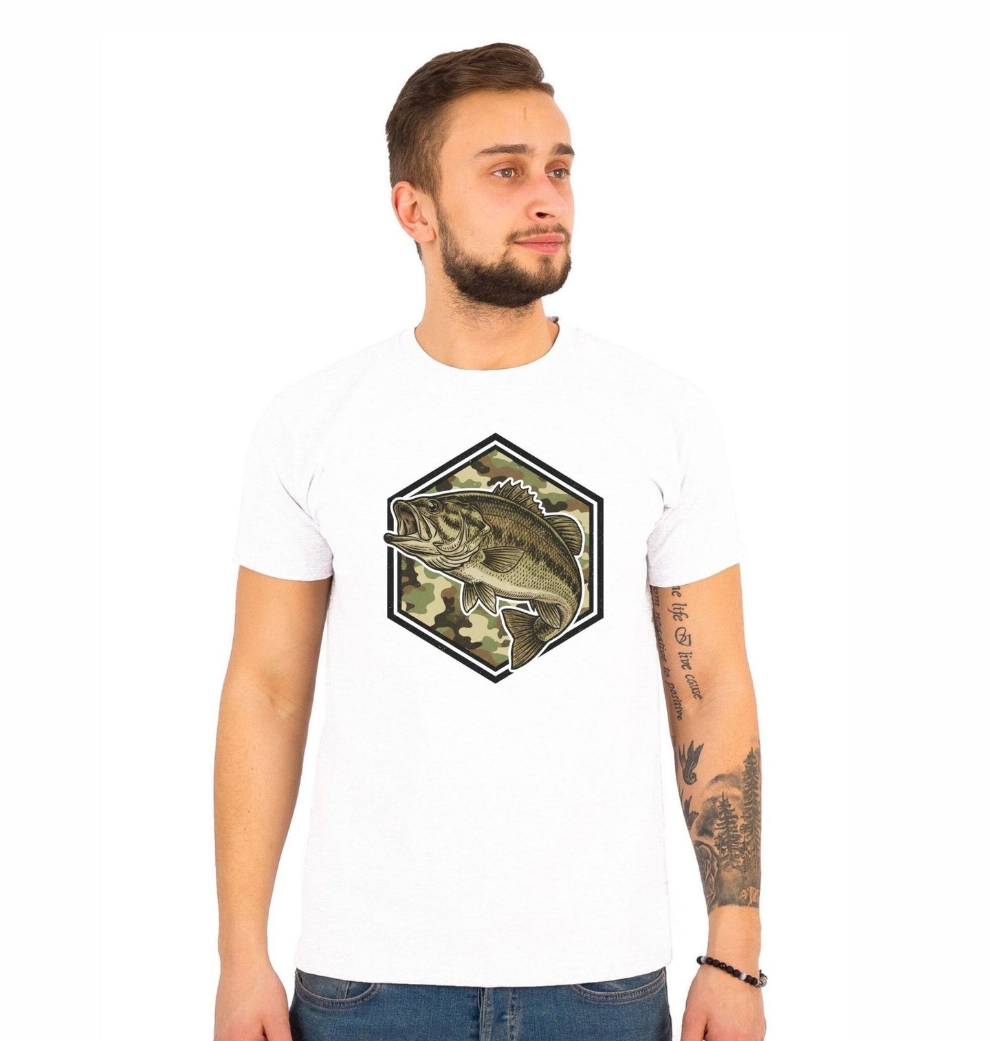 Pánské tričko Maskáčový Okounek Camo Bass Fish. Tahle ilustrace zachycuje ikonického dravce – ryba okounek pstruhový – v atraktivním maskáčovém designu, který potěší každého vášnivého rybáře. Ať už lovíte z lodi, z břehu nebo jen fandíte rybářské kultuře, tenhle motiv je jasná volba.