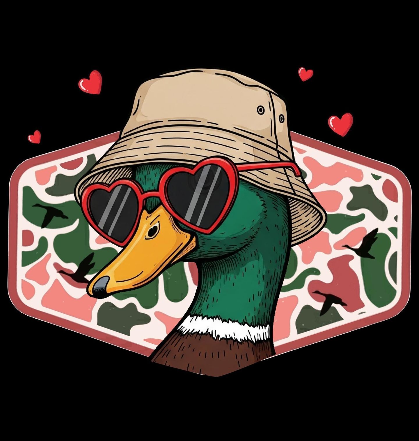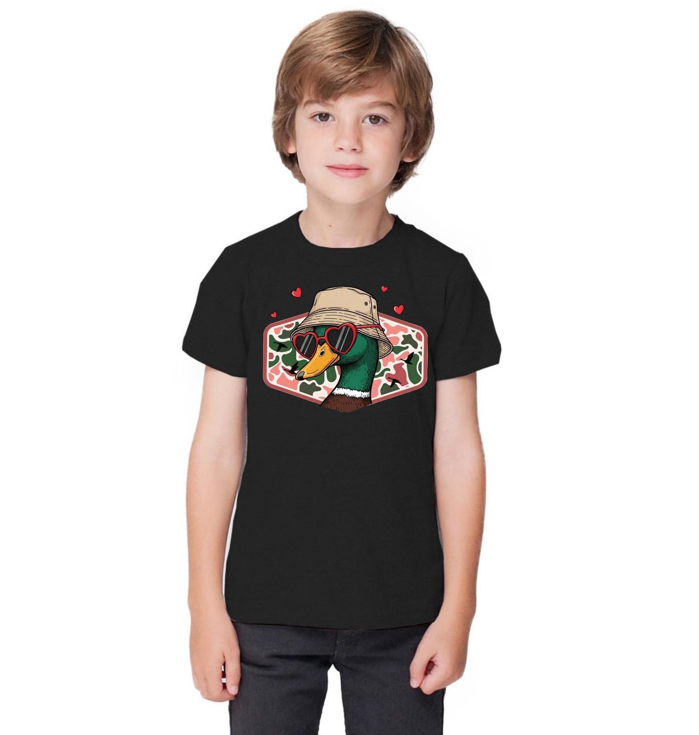 Dětské tričko Maskovaná Kachna na Lovu. Stylová a hravá ilustrace zobrazuje moderní kachna s kloboukem a výraznými brýlemi ve tvaru srdce, která vyzařuje pohodu a dobrou náladu. Tento originální motiv spojuje humor, styl a romantický nádech, díky čemuž je ideální pro každého, kdo má rád netradiční design. Tato kachna je symbolem originality a sebevědomí – ukazuje, že i jednoduchý motiv může být výrazný a zábavný.