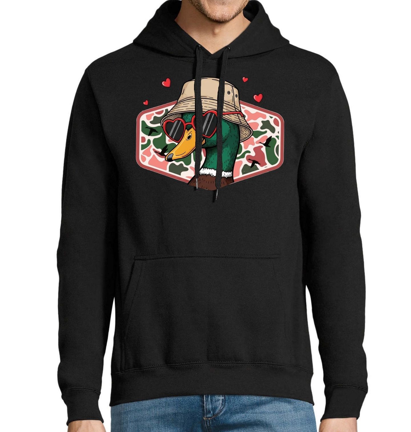 Pánská mikina Maskovaná Kachna na Lovu. Stylová a hravá ilustrace zobrazuje moderní kachna s kloboukem a výraznými brýlemi ve tvaru srdce, která vyzařuje pohodu a dobrou náladu. Tento originální motiv spojuje humor, styl a romantický nádech, díky čemuž je ideální pro každého, kdo má rád netradiční design. Tato kachna je symbolem originality a sebevědomí – ukazuje, že i jednoduchý motiv může být výrazný a zábavný.
