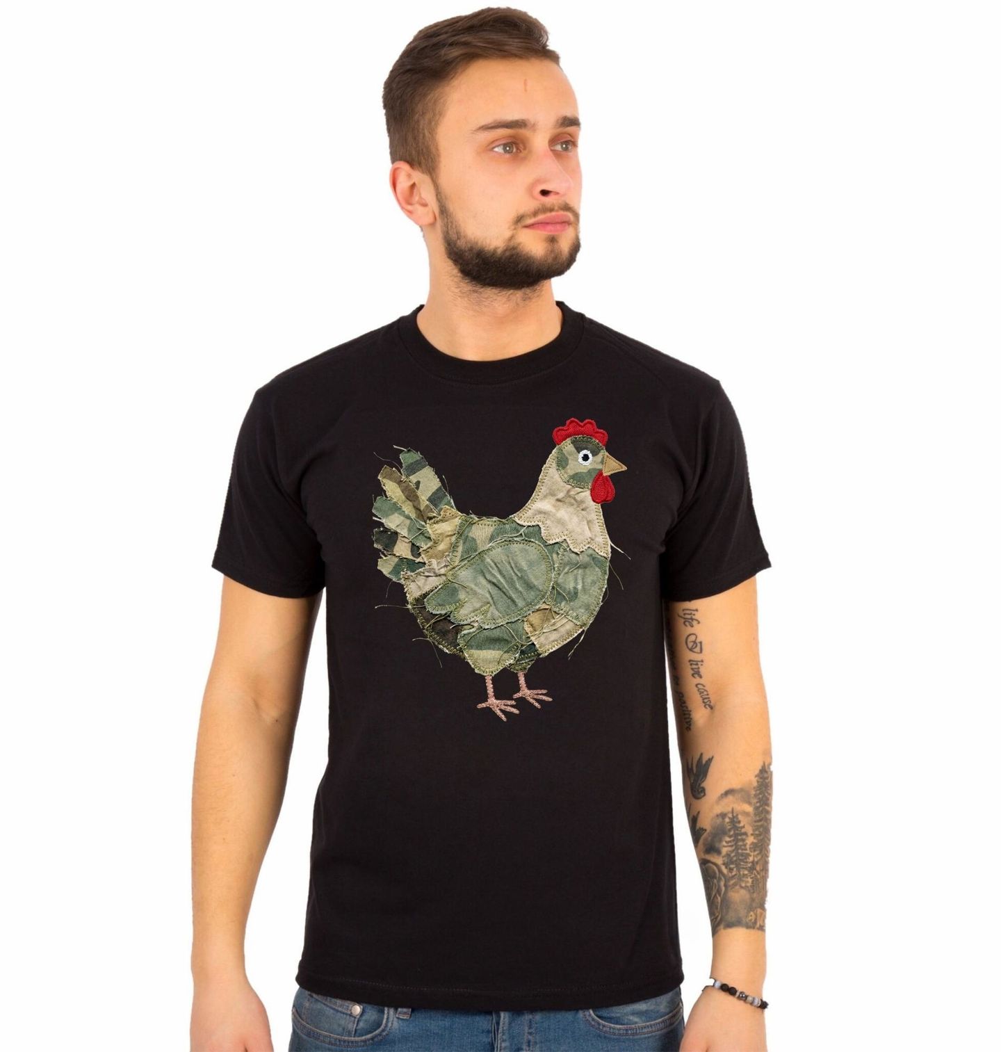 Pánské tričko Maskovaná Slepice. Originální motiv zobrazuje slepice v netradičním provedení, které působí jako zaplátovaná z různých kusů látky v maskáčovém stylu. Kombinace vojenského vzoru a patchwork vzhledu vytváří jedinečný kontrast mezi drsným designem a venkovskou atmosférou, jakou evokuje farma.