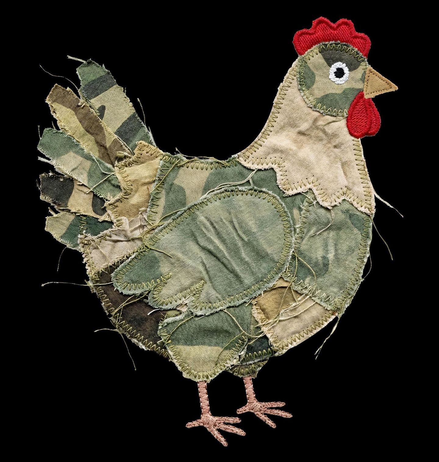 Dámské tričko Maskovaná Slepice. Originální motiv zobrazuje slepice v netradičním provedení, které působí jako zaplátovaná z různých kusů látky v maskáčovém stylu. Kombinace vojenského vzoru a patchwork vzhledu vytváří jedinečný kontrast mezi drsným designem a venkovskou atmosférou, jakou evokuje farma.