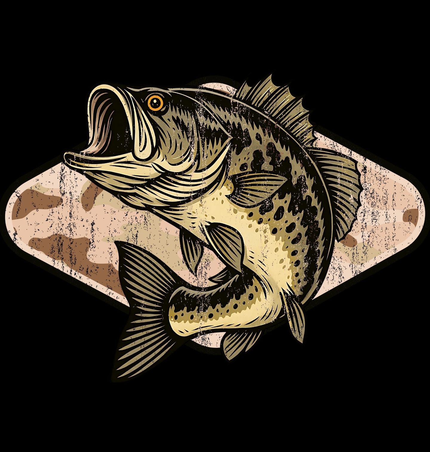 Pánské tričko Maskovaný Okounek pstruhový. Stylový motiv se siluetou mohutné ryby připomínající largemouth bass (Okounek pstruhový) je skvělou volbou pro každého rybáře, který miluje rybaření na maximum. Tato ryba je známá svou bojovností, a právě proto je vyhledávaným úlovkem sportovních rybářů po celém světě.